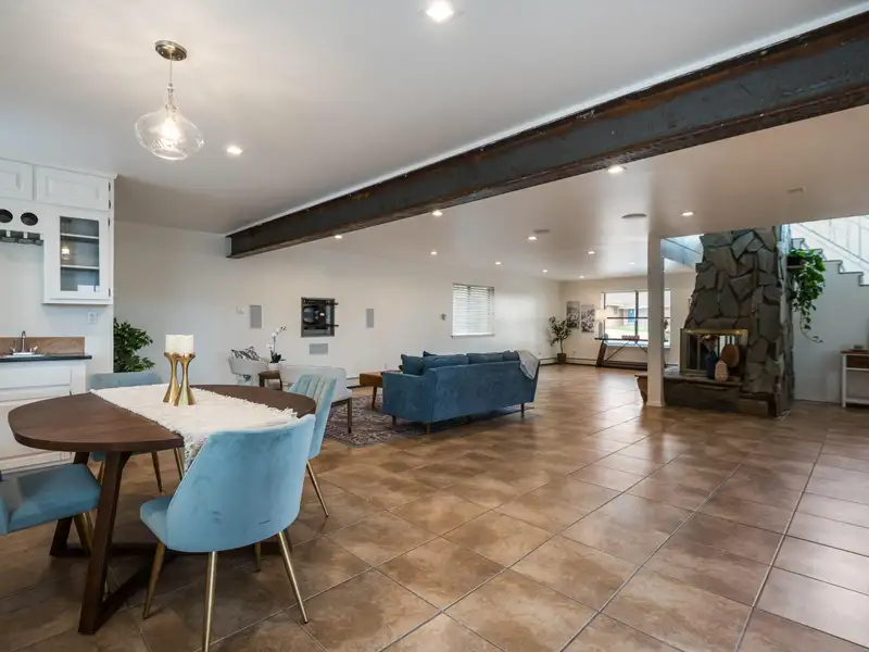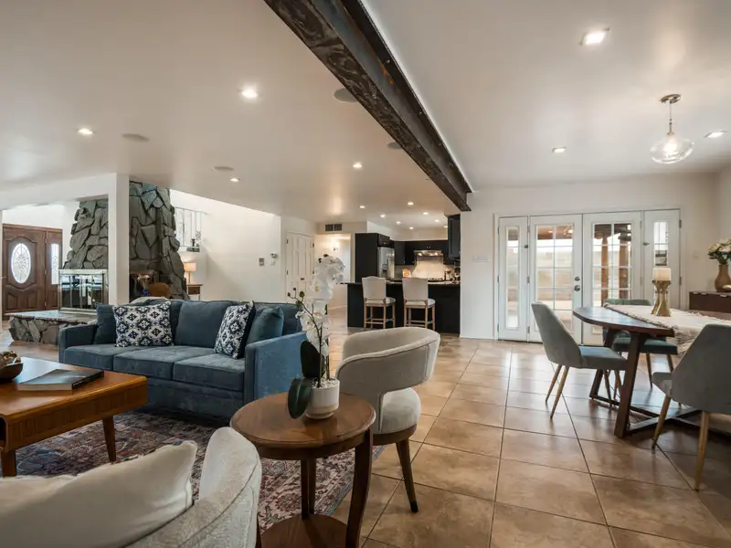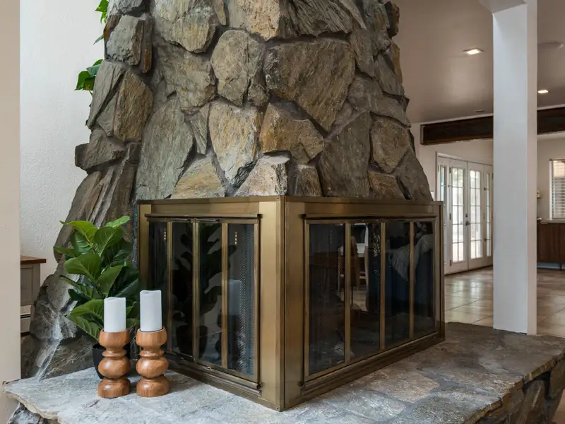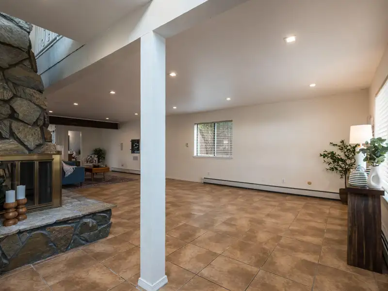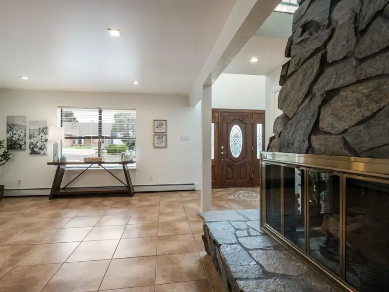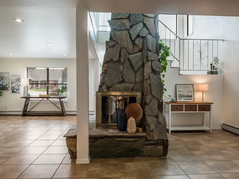 - Stone fireplace in open living area