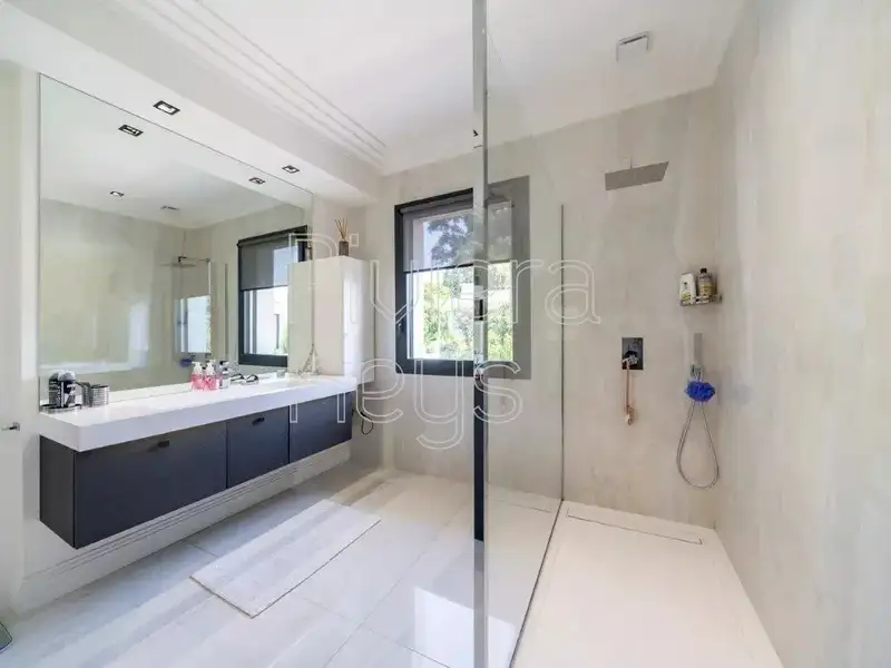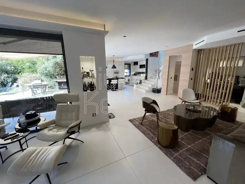 Set within a peaceful and secure estate, just a few minutes’ walk from the beaches and shops, this superb contemporary villa,with a total surface area of 247 m², south-facing, sits on a beautifully landscaped garden with a 13 x 4 m saltwater pool. The spacious and bright living area with a fully equipped kitchen opens onto the garden and also includes a study corner and a cosy lounge area. Upstairs, 3 en-suite bedrooms, including a master suite, complete the main level. A fourth bedroom also benefits from its own bathroom. The property additionally offers a large garage, a carport for 2 cars, a laundry room, a storage area and a games room.