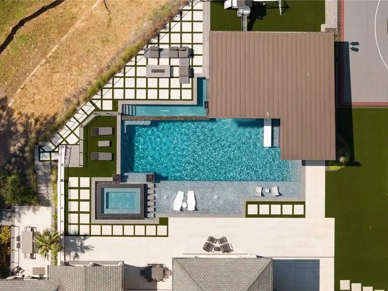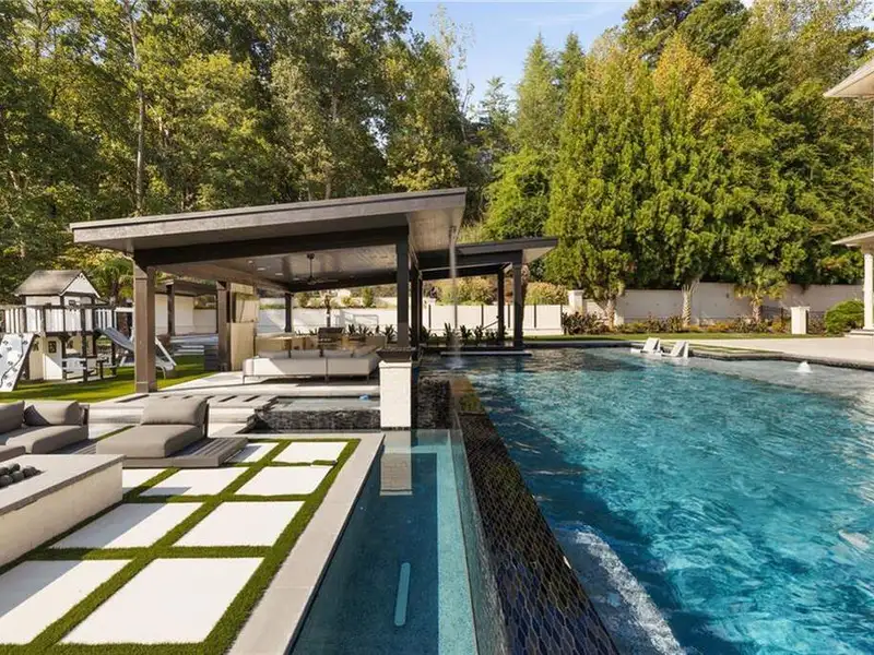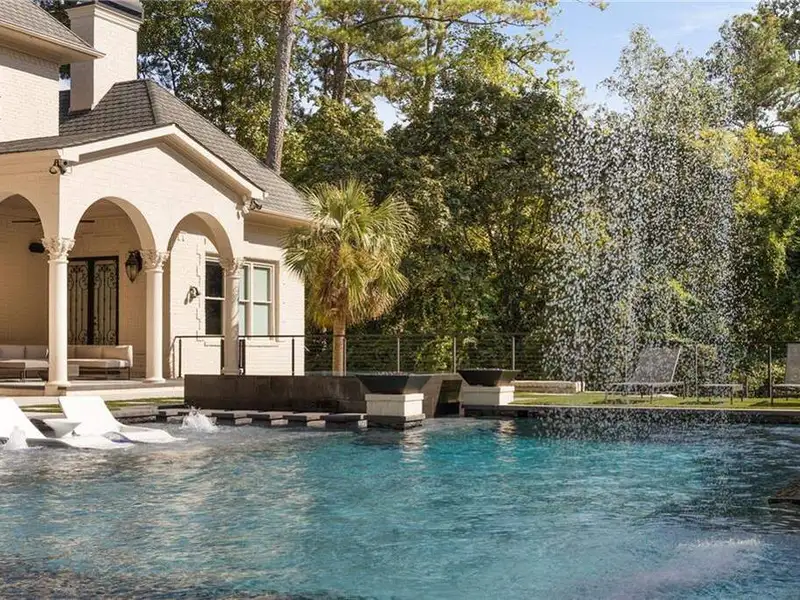 - Resort backyard with pool and waterfalls