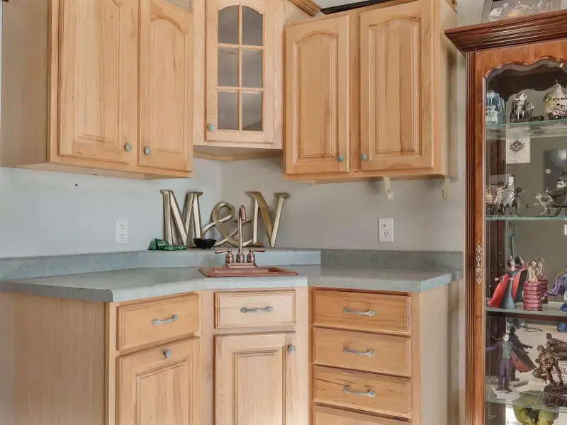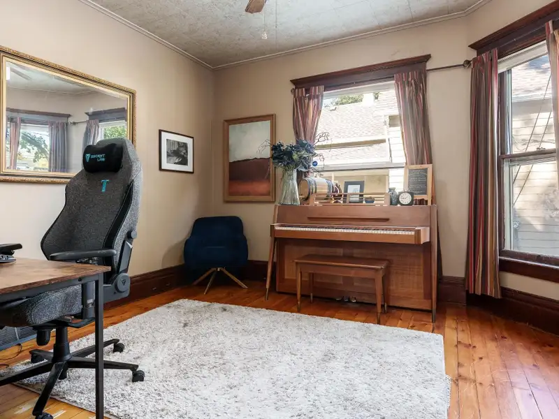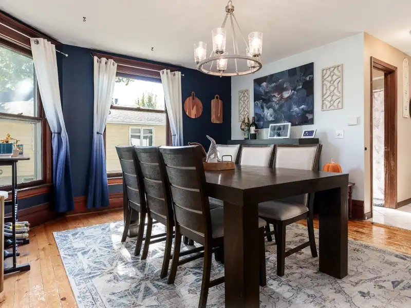 - Rustic hardwood floors in dining room