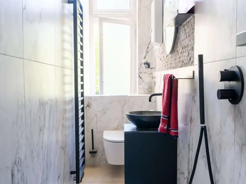 Zwei moderne Bäder sorgen für hohen Alltagskomfort. Das größere Bad überzeugt mit großer Badewanne, Dusche und Doppelwaschtisch – eine kleine Wellness-Oase. Das zweite Bad ist als Gäste-WC mit Dusche gestaltet und fügt sich harmonisch in das Gesamtbild der Wohnung ein.
