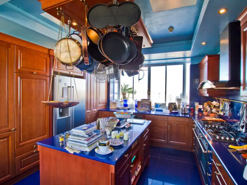 Gourmet entertainer's kitchen with panoramic views, two skylights, German-imported hanging pot rack, blue Italian marble tops and flooring, 10-burner gas stove, built-in grill and deep fryer, 3 refrigerators, wine cabinet, incinerator, dishwasher, and 2 industrial extract fans.