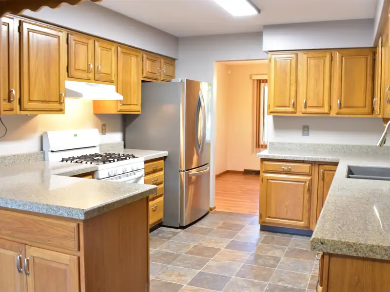 - Eat-in kitchen with oak cabinets, granite