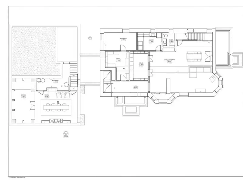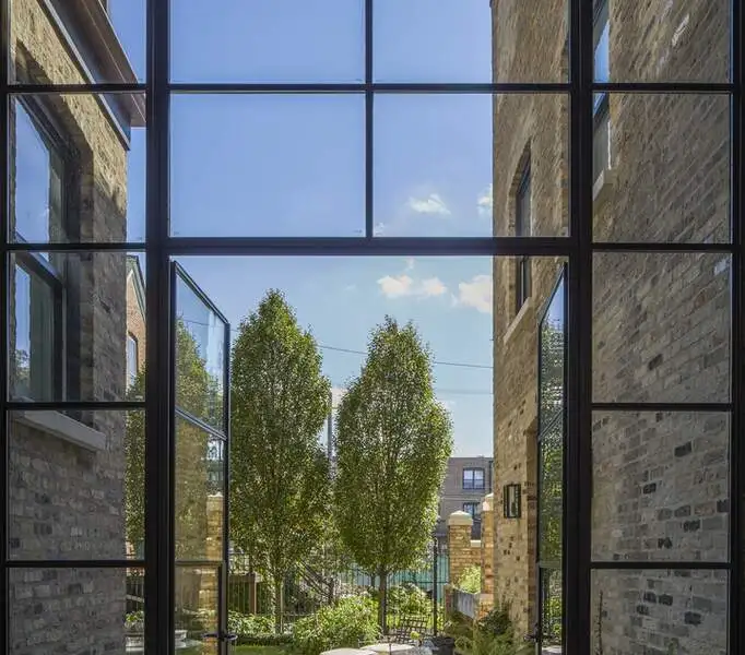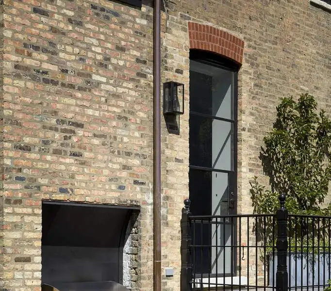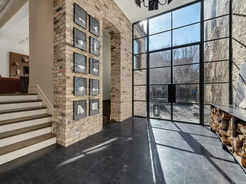 - Glass-enclosed vestibule connecting coach house