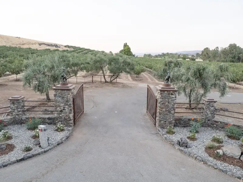 - Grand entrance with iron gates and rock columns