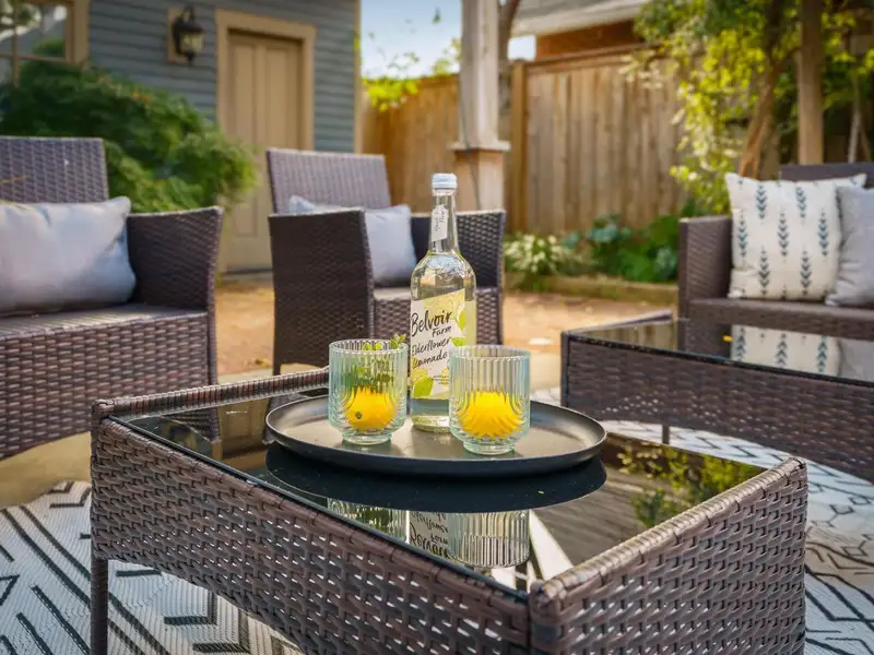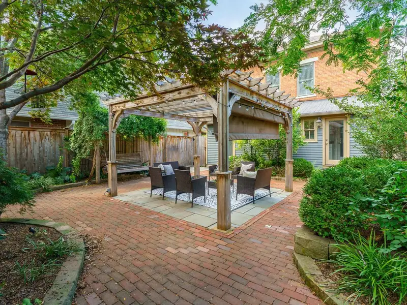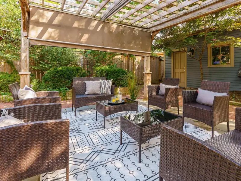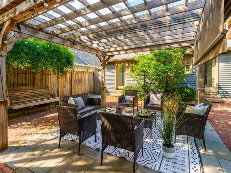 - Private fenced patio with pergola