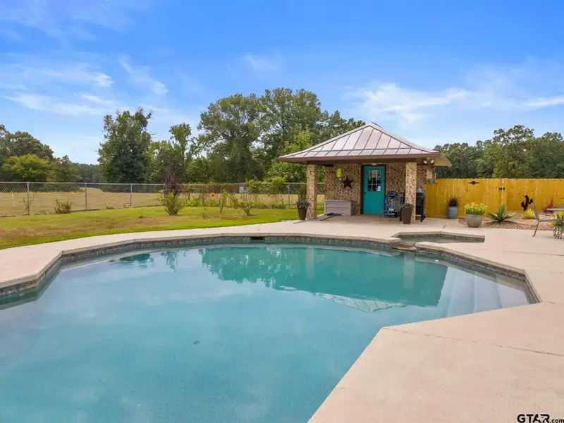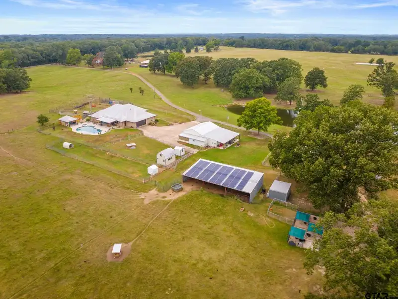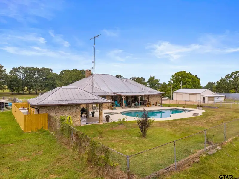 Expansive Ranch Estate! Welcome to your private retreat - 3364 sq ft of comfortable ranch-style living nestled on 160 fully fenced acres. This exceptional property is designed for both relaxation and recreation, featuring five ponds, including a picturesque lake out front complete with a fountain and pavilion. The land is fenced with hog wire around the perimeter, keeping hogs out but allowing plenty of deer in. It is also cross-fenced for horses and cattle, offering versatility for ranching or livestock. The main residence offers 4 spacious bedrooms, including two en-suites, 3.5 bathrooms, a generous kitchen and living area, two dining spaces, and a versatile den/office. An attached 2 car garage includes built-in storage, a second oven, and a convenient half bath. Enjoy outdoor living with a relaxing in-ground pool and hot tub, paired with a pool house that provides a full bath for easy entertaining. For work and play, the property also includes 4 wells with reverse osmosis filtering system, generator that powers the house and shop, a large workshop with dual lean-tos, an additional shop with living quarters, multiple storage buildings, equipment shed with a drop shed for horse stalls, and a charming 2 bed, 1 bath cabin, perfect for guests or extended family. This rare gem combines wide open spaces with luxury amenities, creating the ultimate country lifestyle with room to spread out and enjoy.