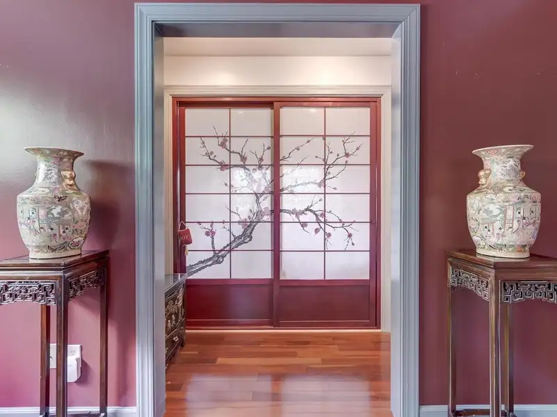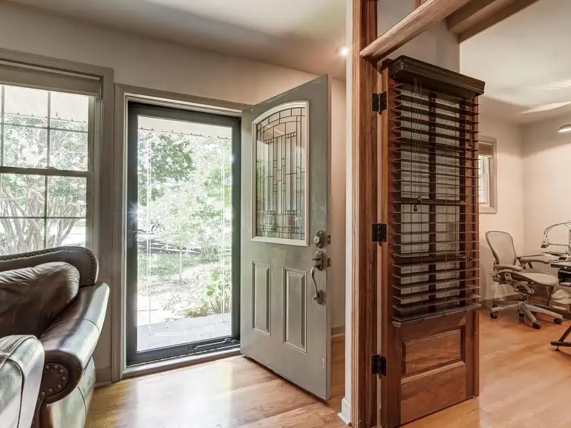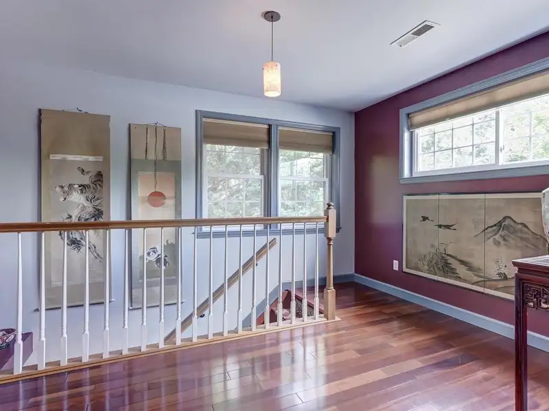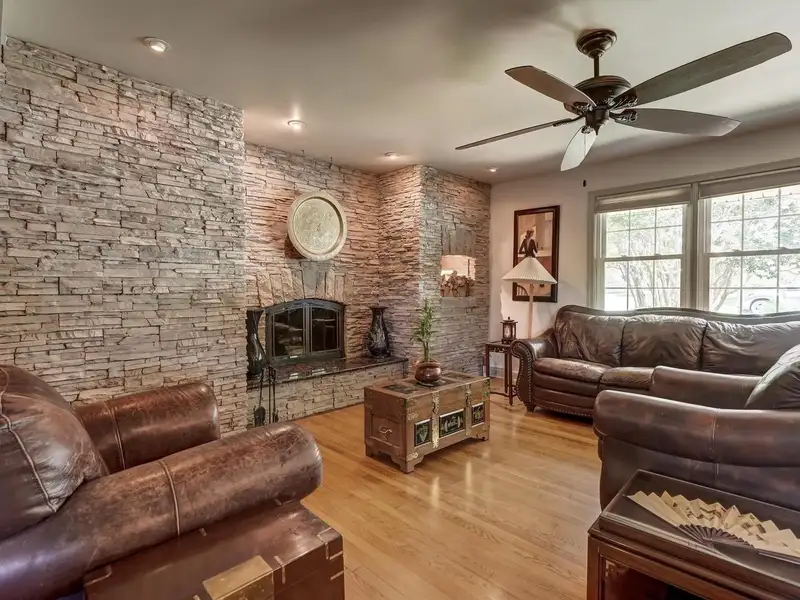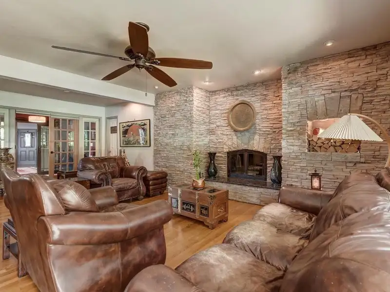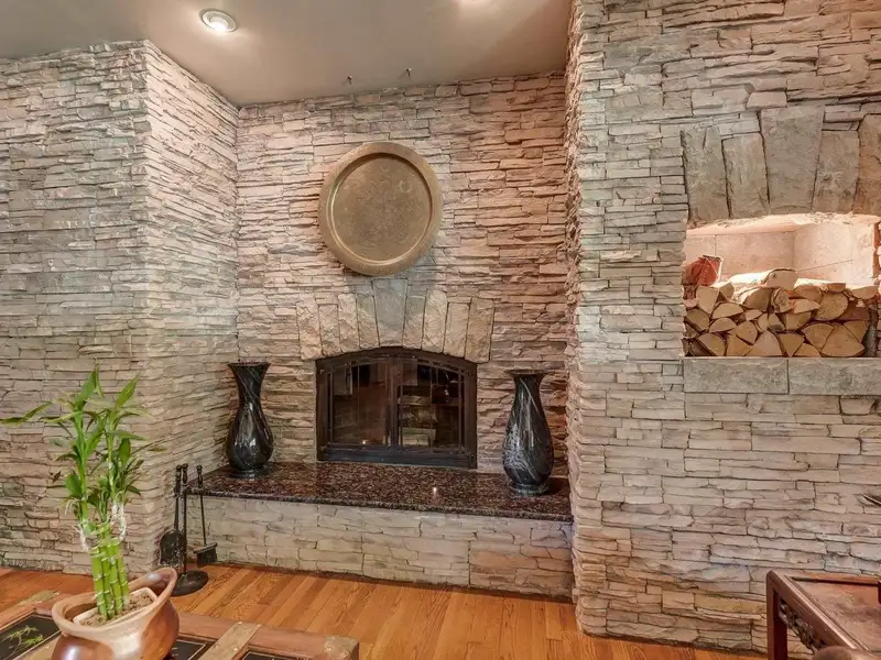 - Floor-to-ceiling stone fireplace