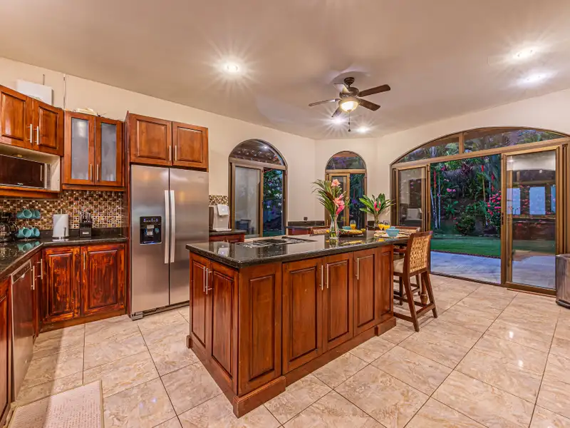 Venture outdoors to indulge in resort-style living: lounge on the massive infinity pool’s sun-kissed recliners, dine al fresco at the teak table, or cook in the outdoor kitchen with a built-in BBQ, sink, and burner. The covered patio creates a perfect retreat for relaxing while enjoying the gentle surf sounds and panoramic vistas. Surrounding the villa are lush gardens, ample outdoor furniture, and a private yard—an idyllic setting for weddings, yoga retreats, or exclusive getaways.