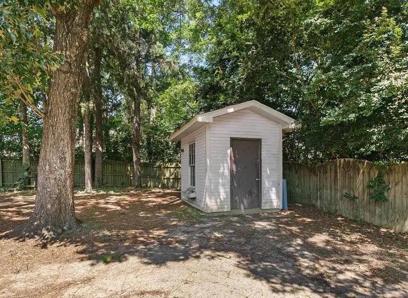 - Large backyard with deck and storage buildings