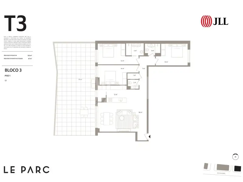 Apartamento T3 novo, com 130 m2 de área bruta privativa, terraço, estacionamento e arrecadação, no Le Parc Faro, Algarve.