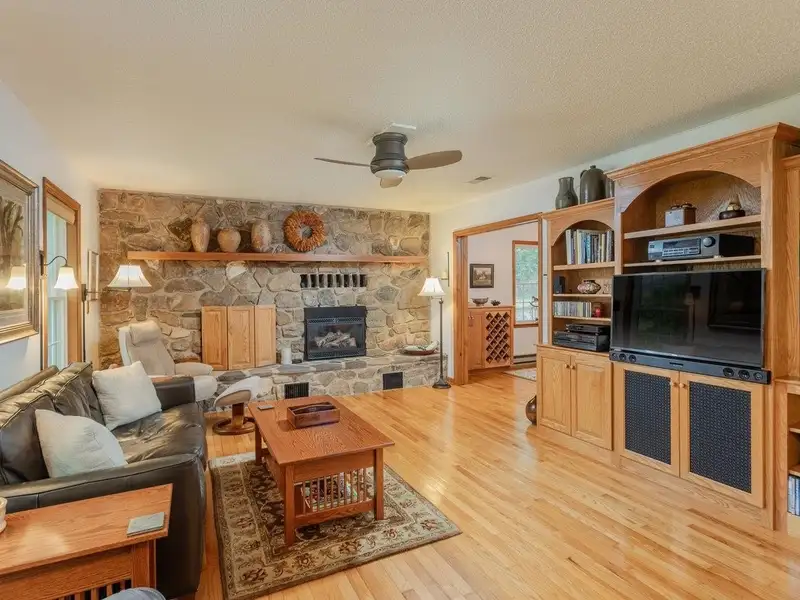 - Stone fireplace with gas log insert