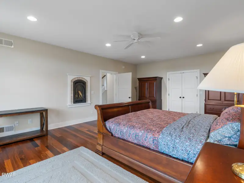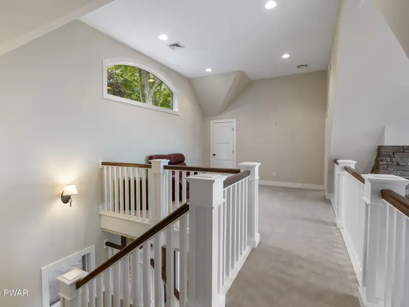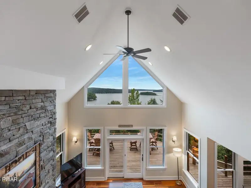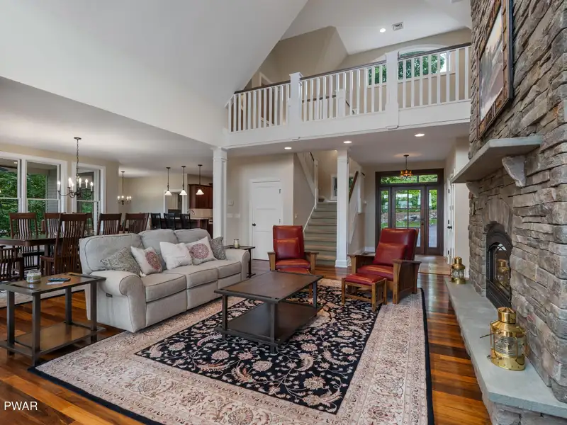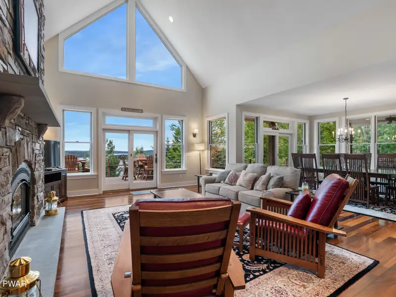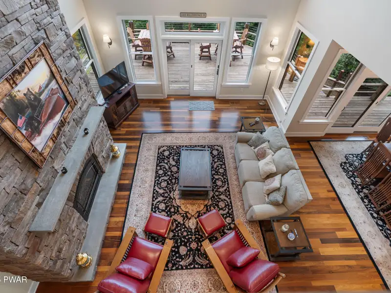 - Floor-to-ceiling stone fireplace