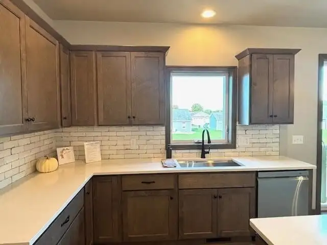 - Kitchen with quartz countertops and island