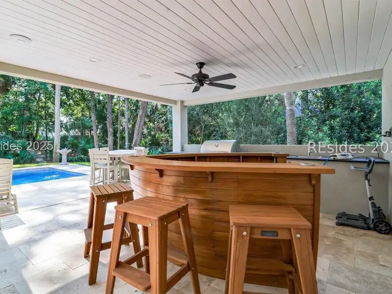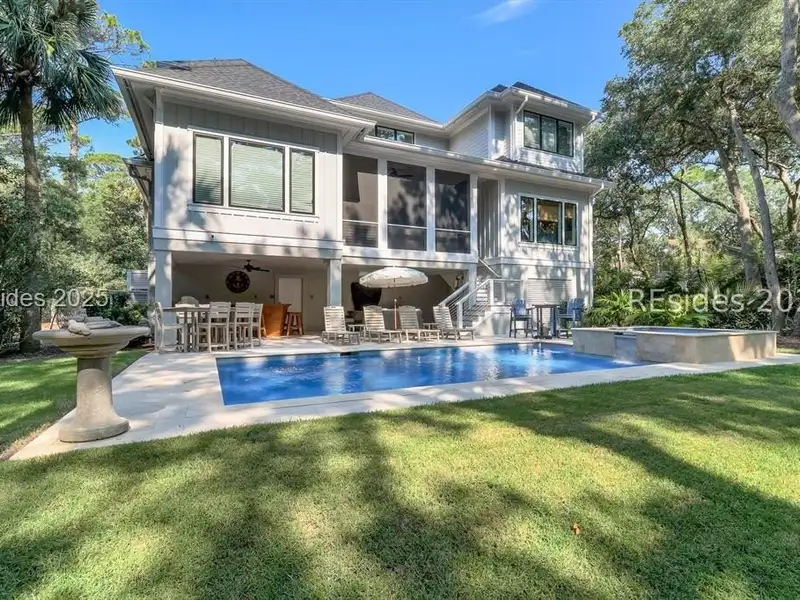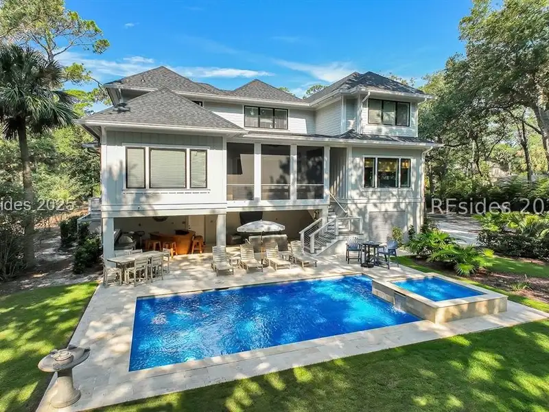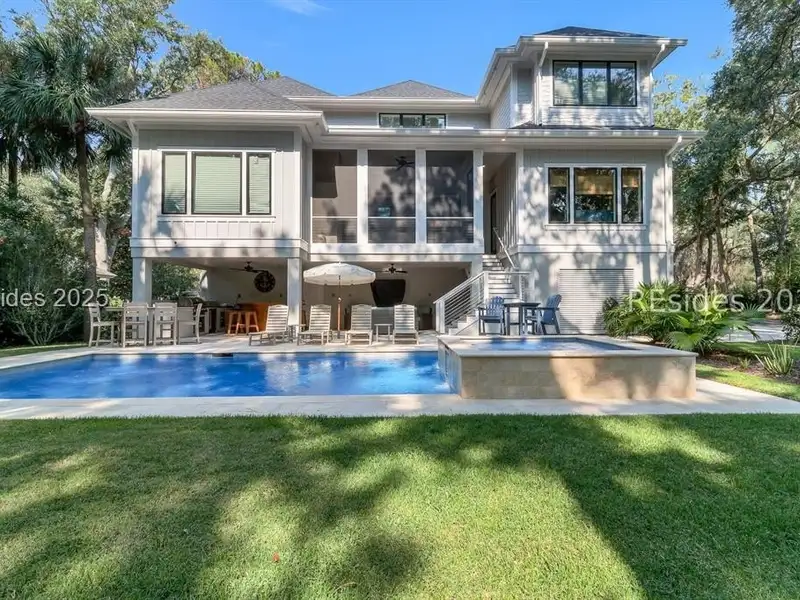 Luxury Coastal Living in Palmetto Dunes. This exceptional newly built residence (2025) truly has it all-just three rows from the beach in the coveted Palmetto Dunes community. Thoughtfully designed and masterfully crafted, this home offers 5 spacious bedrooms, 6.5 baths, a 4-car garage, and a private pool and spa surrounded by an inviting outdoor living area and kitchen-perfect for entertaining or relaxing in style. Inside, the chef's kitchen impresses with two expansive islands, Thermador appliances, dual sinks, and designer finishes that blend sophistication with functionality. From the front porch, enjoy a peek of the ocean and the gentle coastal breeze that defines island living. Each bedroom features its own private ensuite bath, including two luxurious primary suites offering comfort and privacy for both owners and guests. A dedicated office, ample storage space on the lower level, and a three-stop elevator add ease and convenience throughout the home. Additional highlights include a tankless water heater, premium craftsmanship, and pristine condition-never used as a rental. This stunning home is ideal as a primary residence, second home, or luxury rental investment, offering the ultimate blend of elegance, location, and lifestyle.