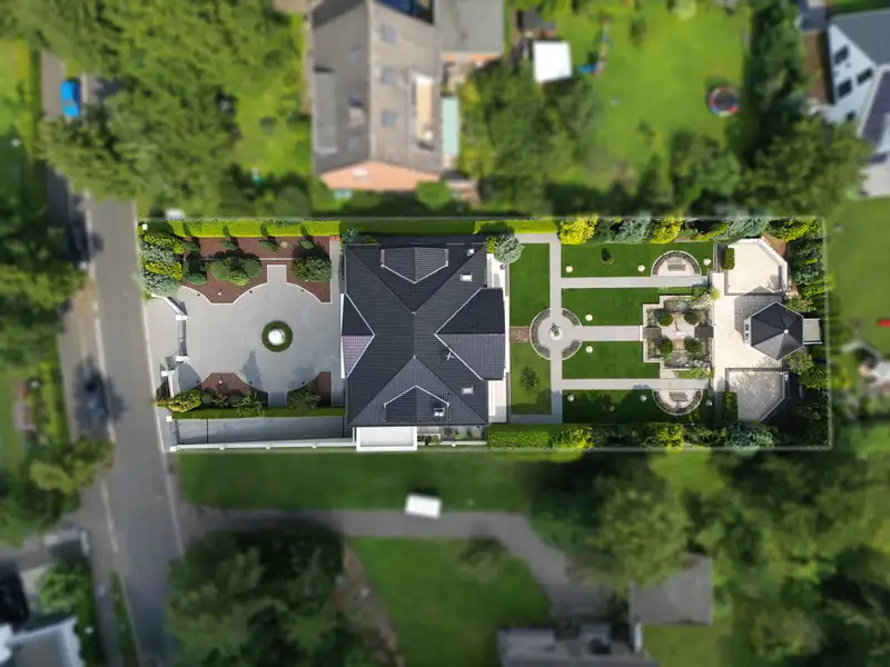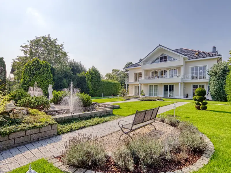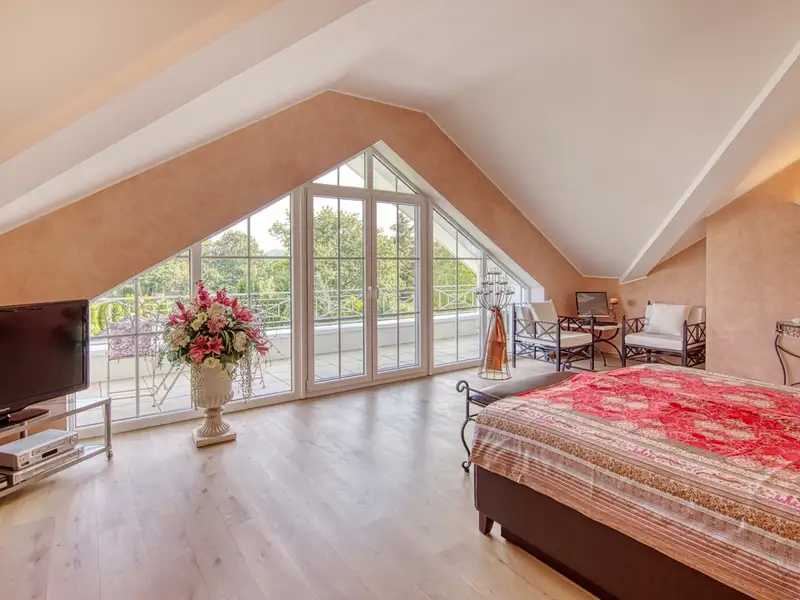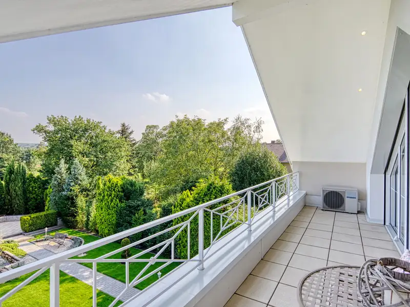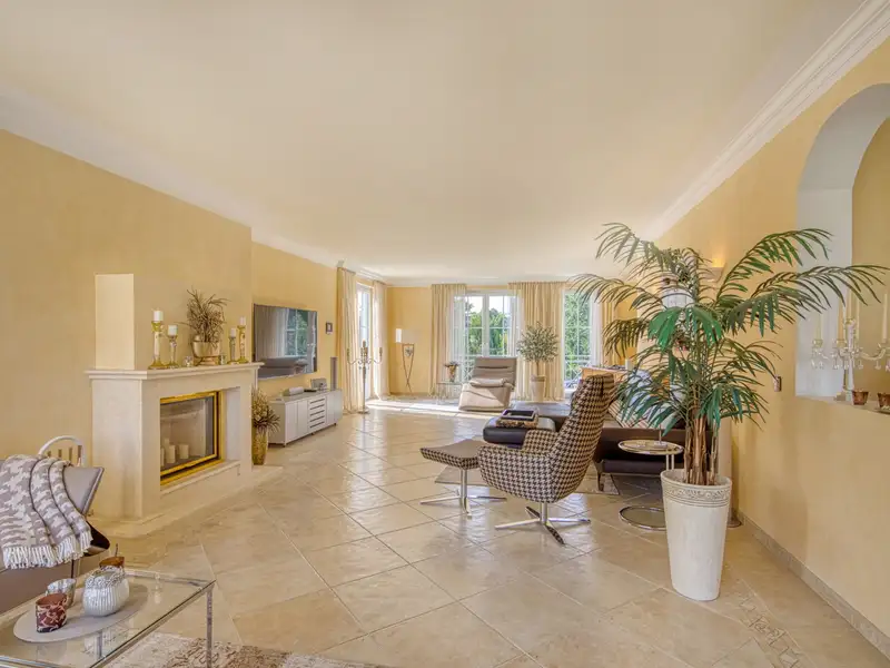 With over 311 m² of living space and a ceiling height of approx. 2.75 meters, the maisonette apartment for sale extends over the upper and top floors and offers a total of five balconies, which open up different lines of sight into the magnificent garden.