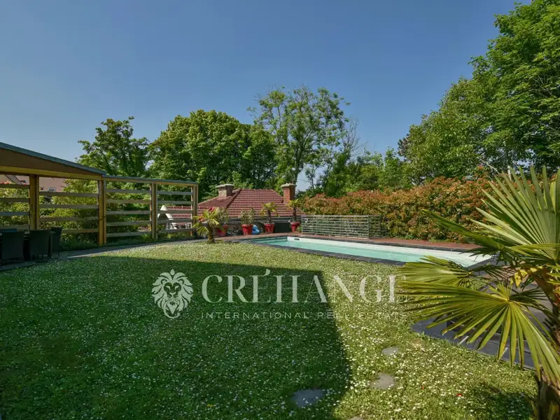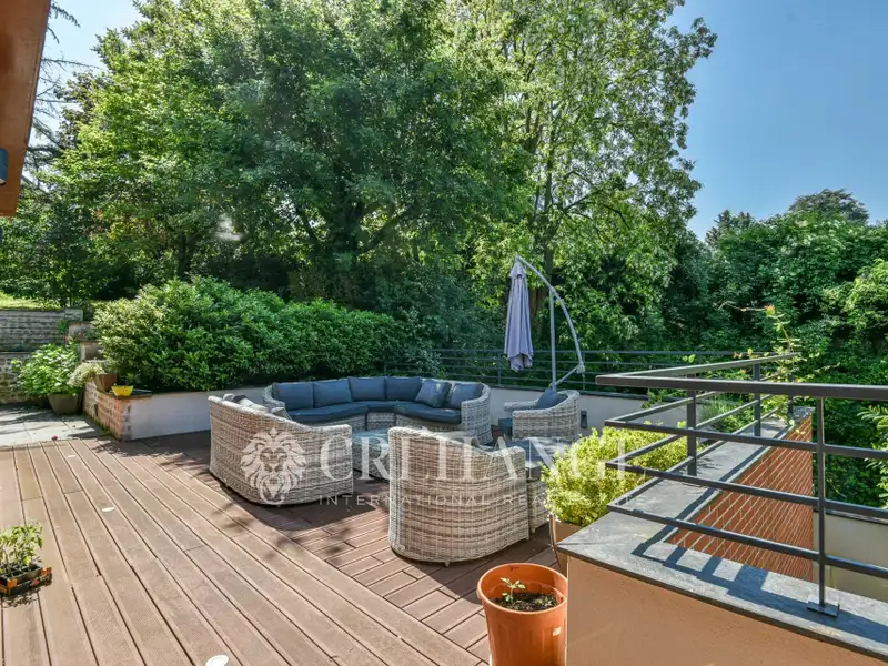 Contemporary home, private and quiet, located just minutes from the L’Étang-la-Ville train station. The garden level features a spacious cathedral-style living room with a modern fireplace, a dining room opening onto several terraces, and a lounge overlooking the pool and jacuzzi. The high-quality kitchen opens onto a winter garden with a summer kitchen area. A master suite with dressing room and full bathroom completes this floor. Upstairs: five bedrooms, a bathroom, a shower room, and a large landing area. On the lower level: a studio, a game room/home cinema, a wine cellar, storage rooms, a laundry room, a boiler room, a sauna, and a garage for 6 to 7 cars. The landscaped garden includes several furnished terraces. The house was built with high-quality materials and is fully equipped with a smart home system. It also features solar water heating, rainwater recovery for toilets and washing machine, double-flow ventilation system, and automatic irrigation.