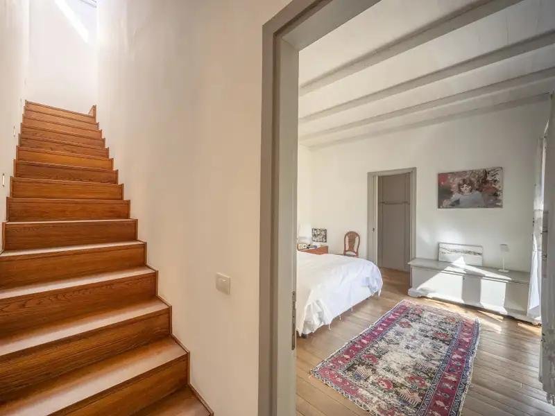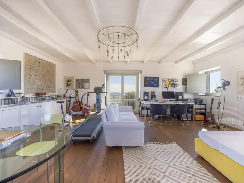 The elegant and functional sleeping area, includes a master suite with walk-in wardrobe and en-suite bathroom, two additional double bedrooms, a second bathroom, and a charming room in the tower ideal as a fourth bedroom or a study with a view. The two wings of the villa are connected by a bright glass hallway that could become a splendid library or art gallery.