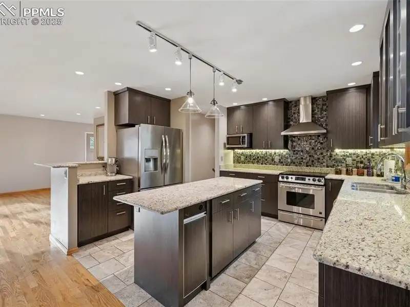 - Large gourmet kitchen with granite countertops