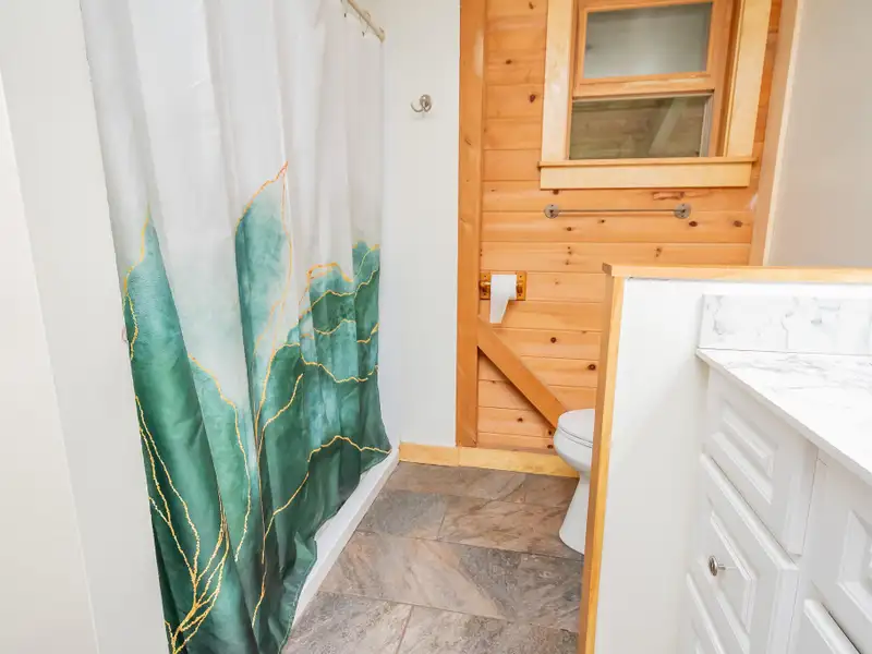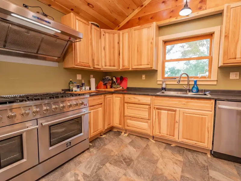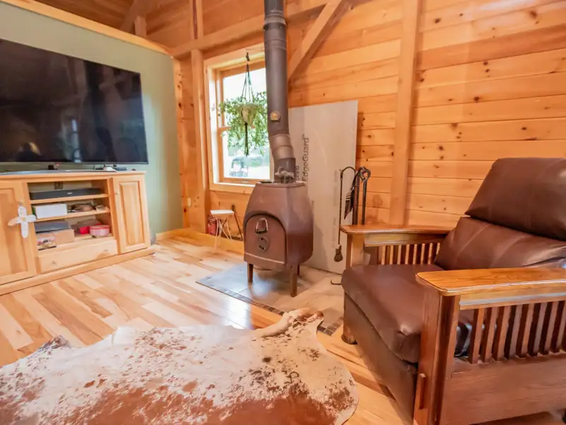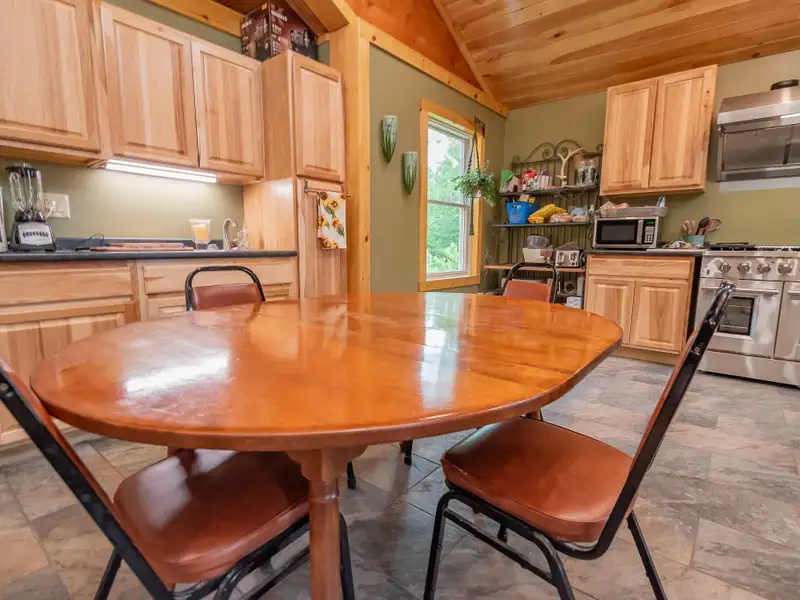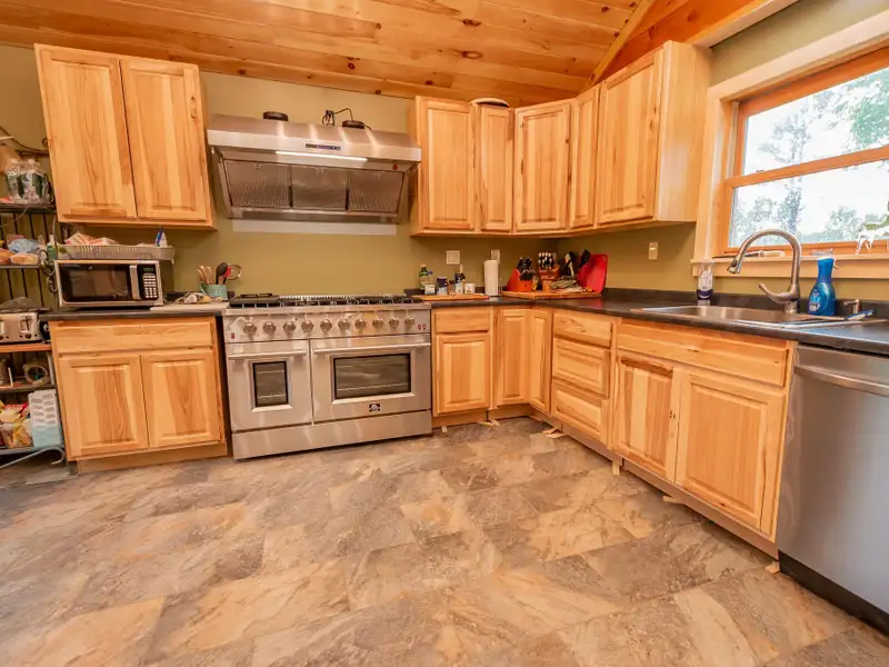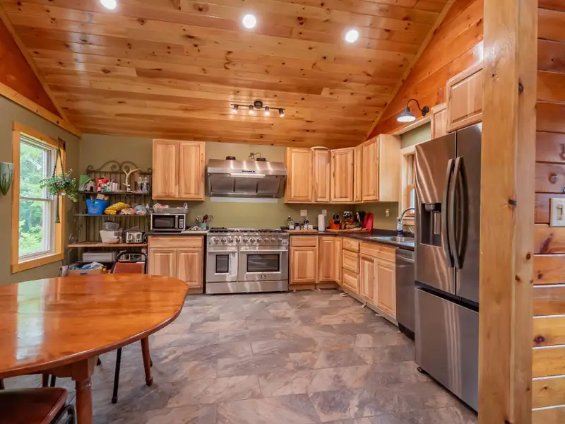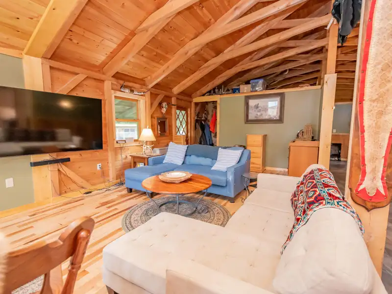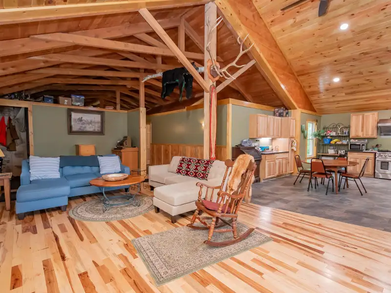 - Vaulted ceilings with exposed beams and hardwood floors