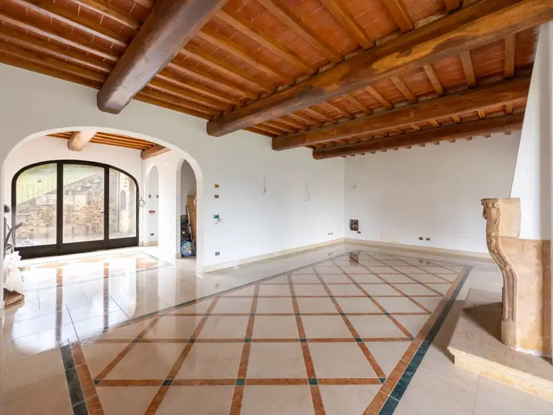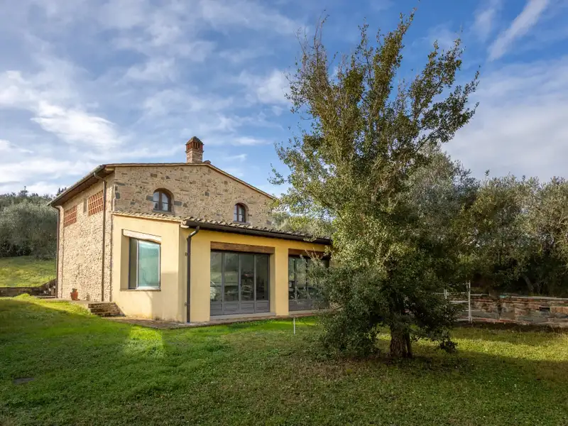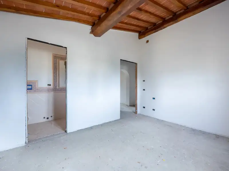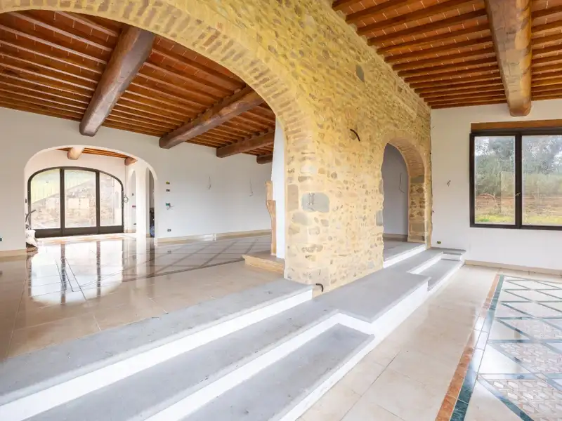 On the ground floor there are two large communicating living rooms with fireplace, a kitchen, a service bathroom and various accessory rooms. On the first floor, three bedrooms, two bathrooms, a utility room and a large terrace overlooking the surrounding countryside.