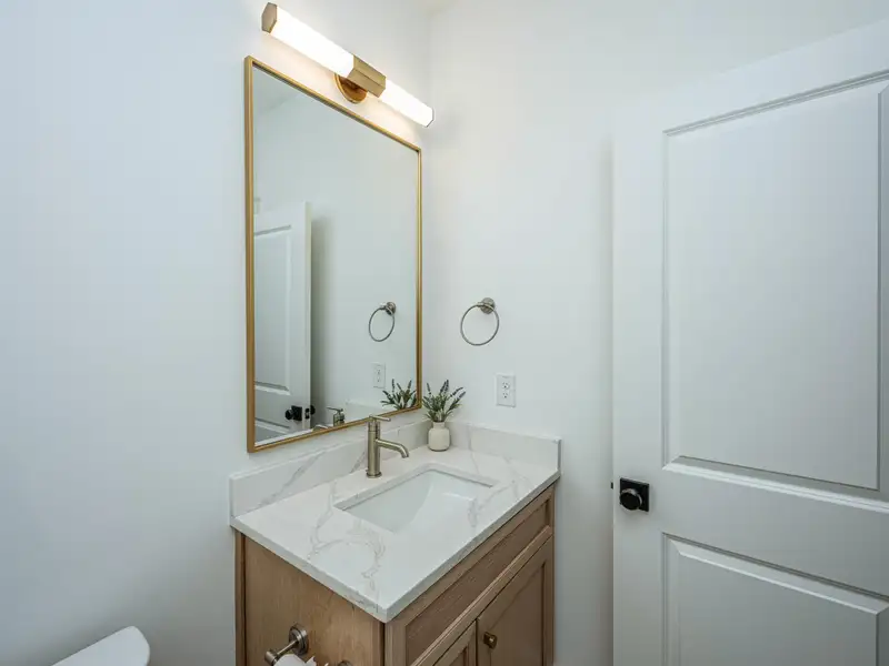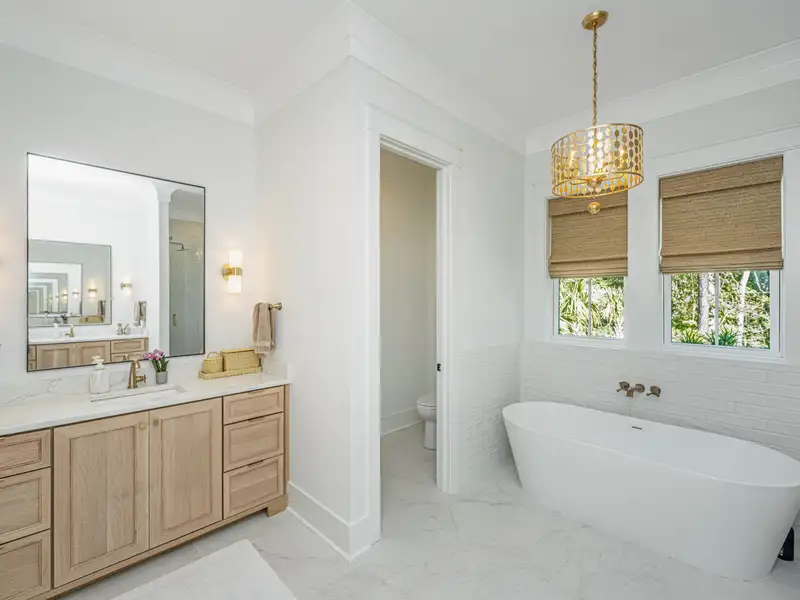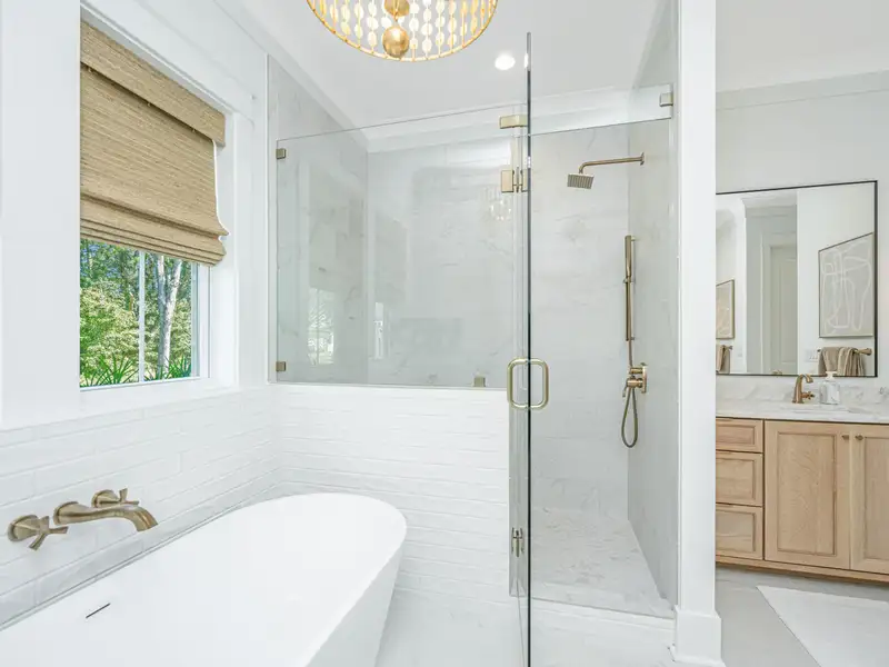 The primary suite is conveniently located on the main floor. It features a dramatic vaulted ceiling, his and her closets leading to a spa-like bath with a freestanding soaking tub, oversized walk-in shower, dual vanities, and private water closet.