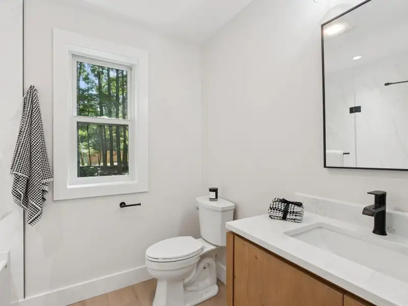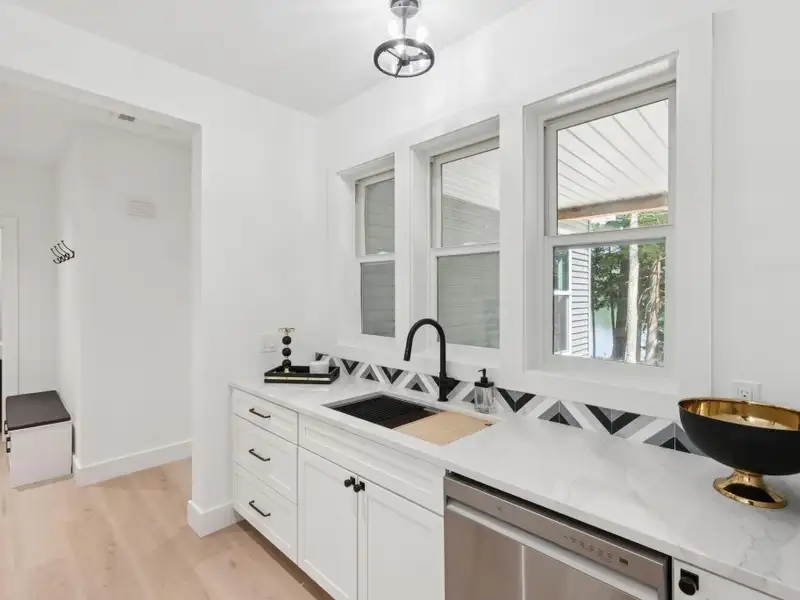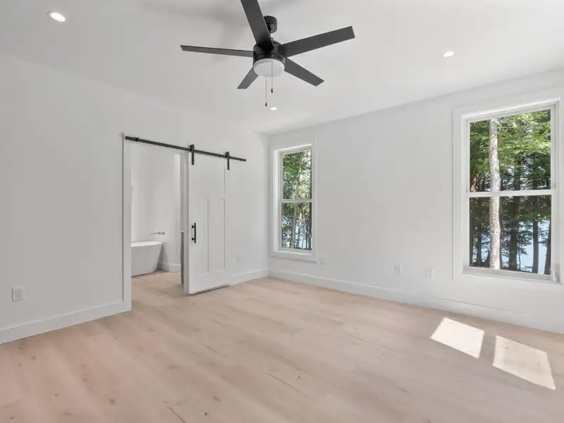 - Large windows with lake views