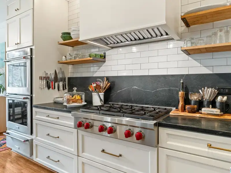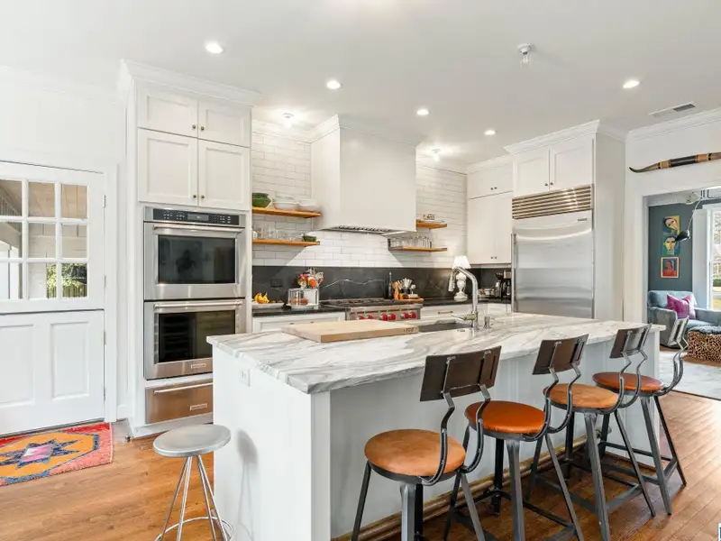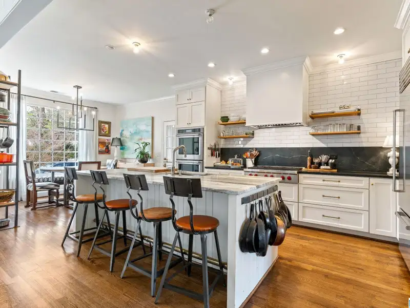 - Kitchen with marble island and gas cooktop