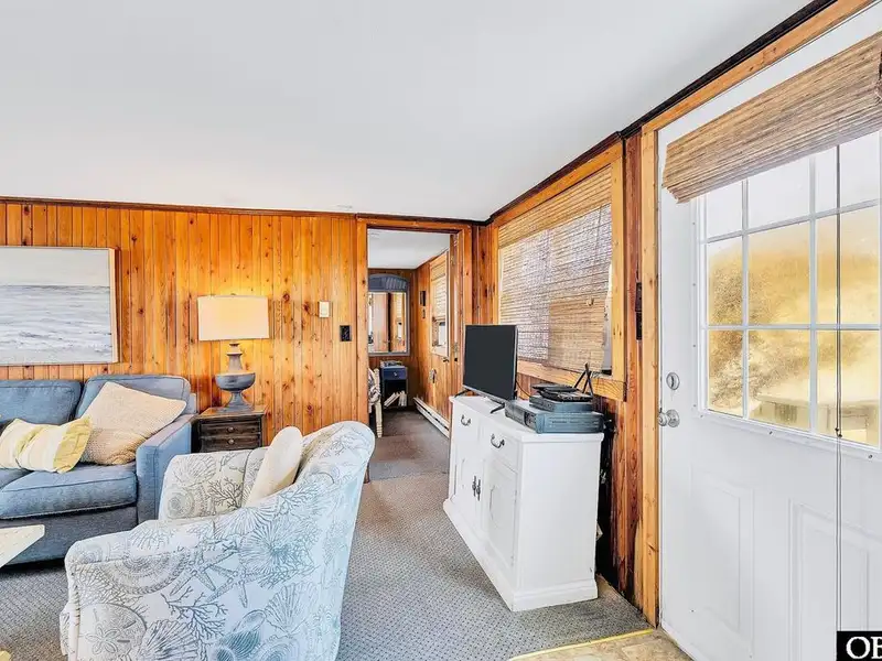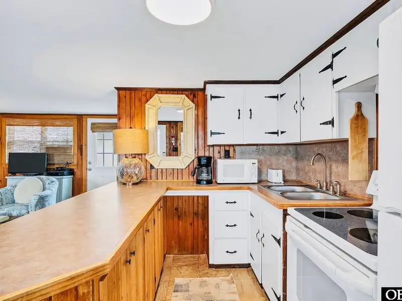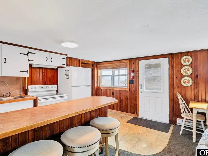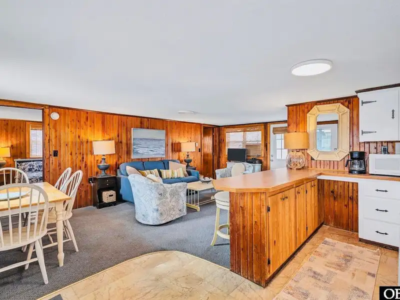 - Open floor plan with cozy wood interior