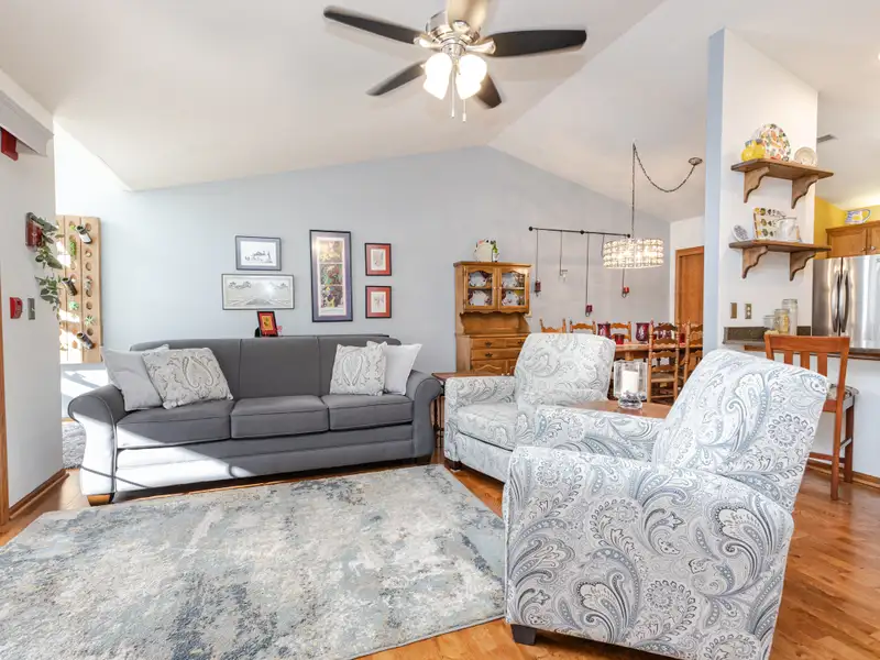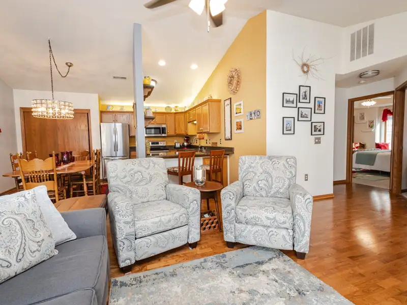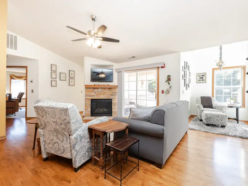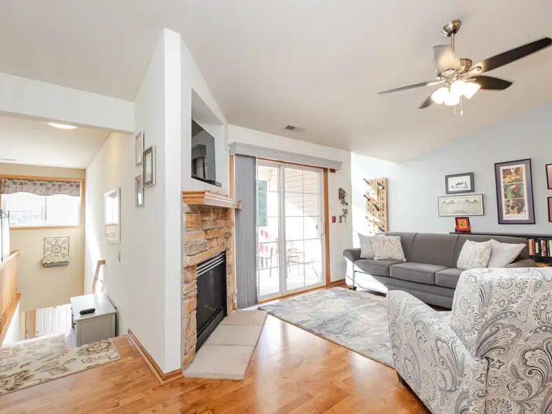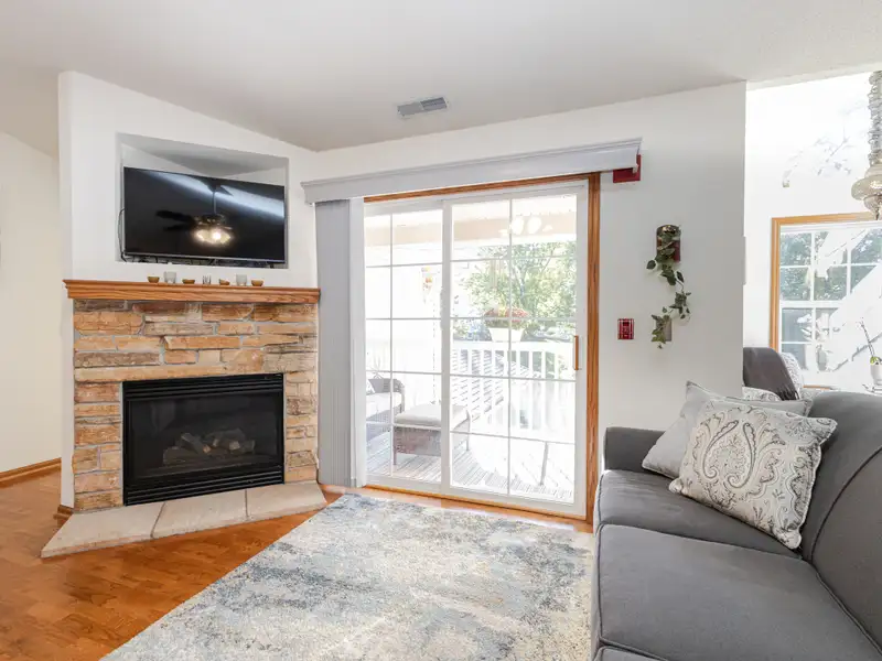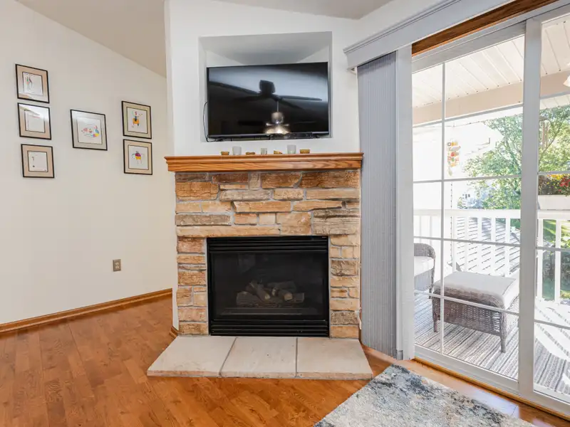 - Open living area with fireplace