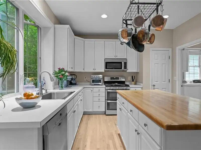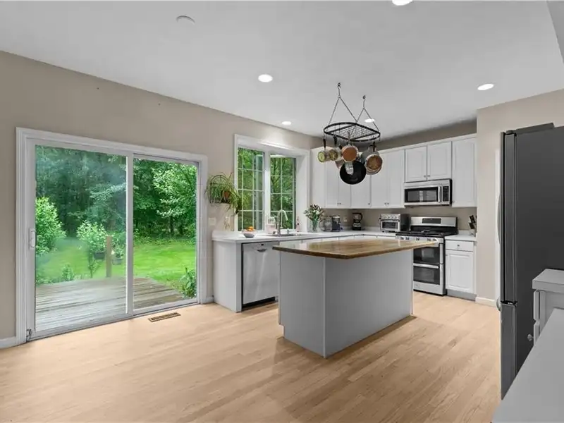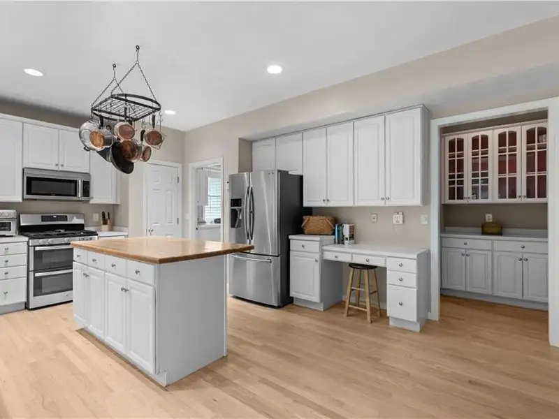 - Kitchen with butcher block island and stainless appliances