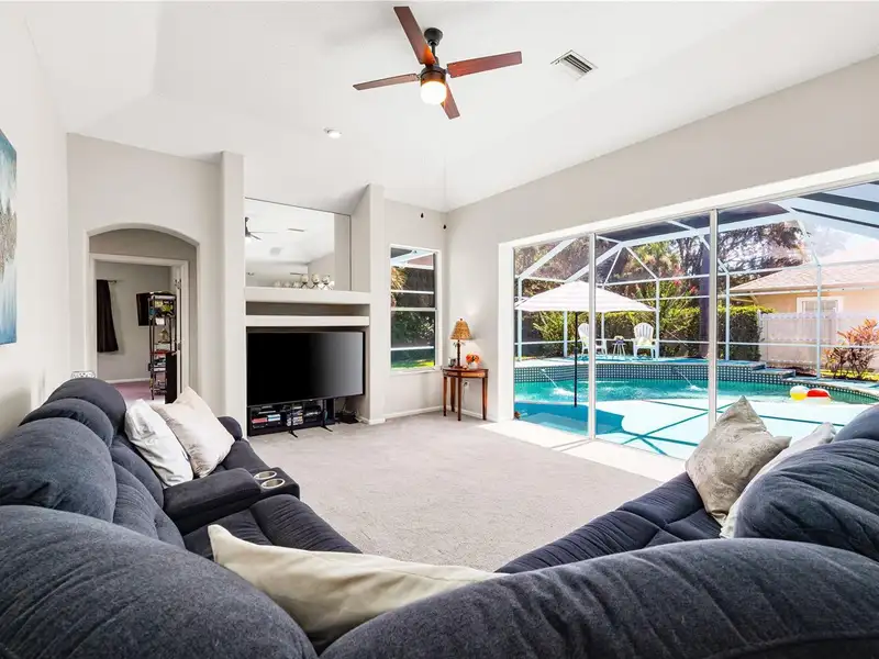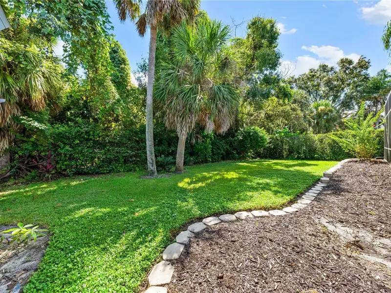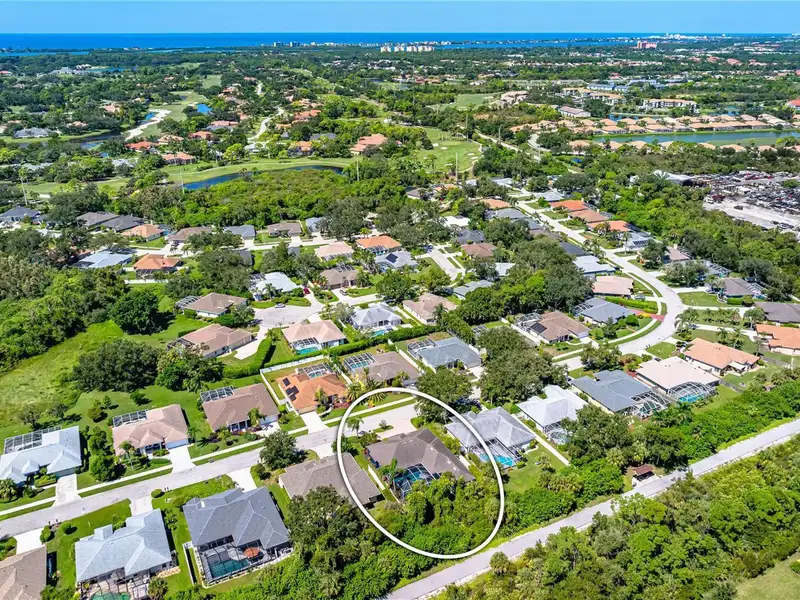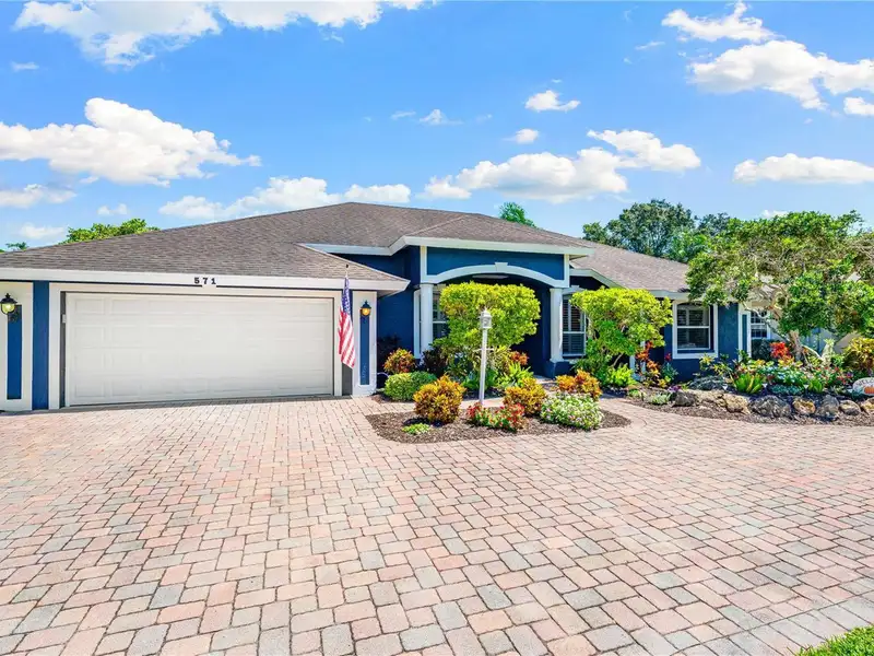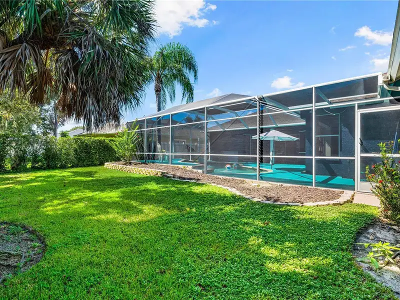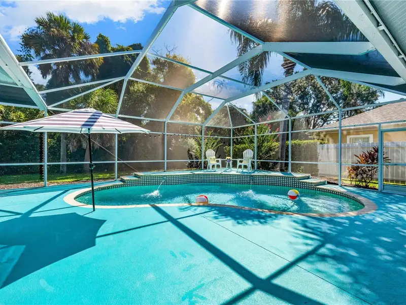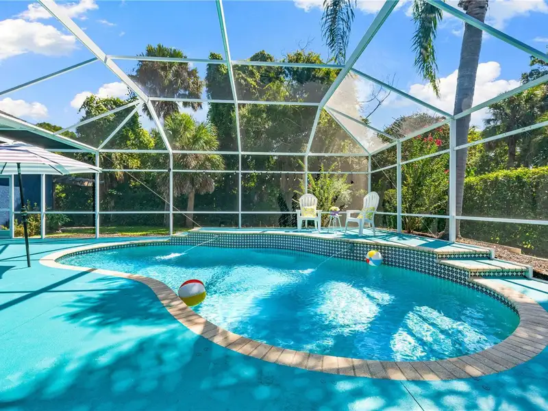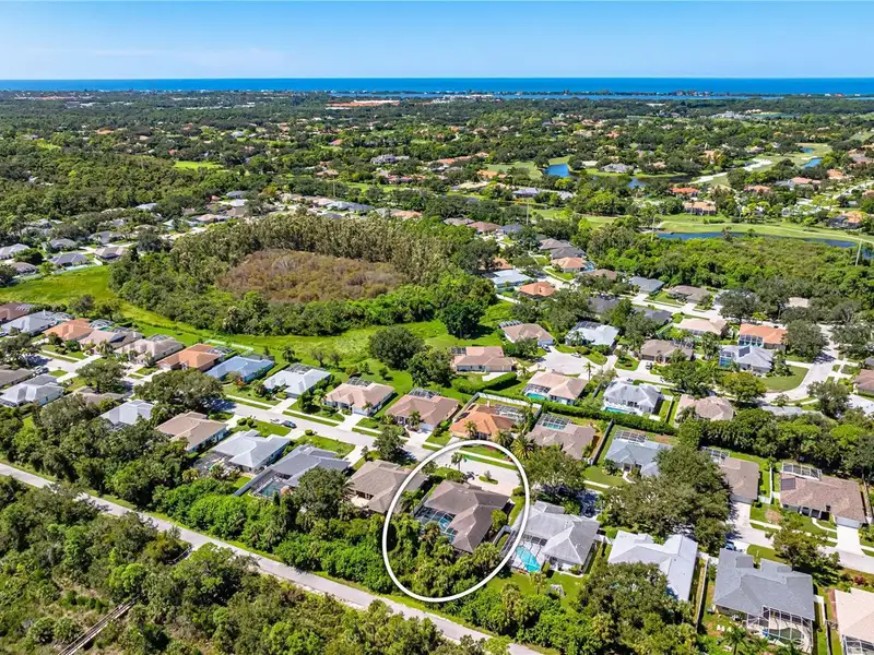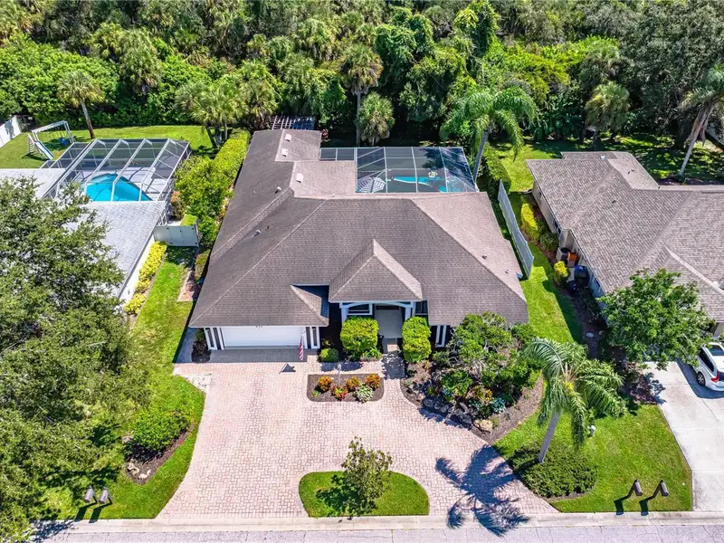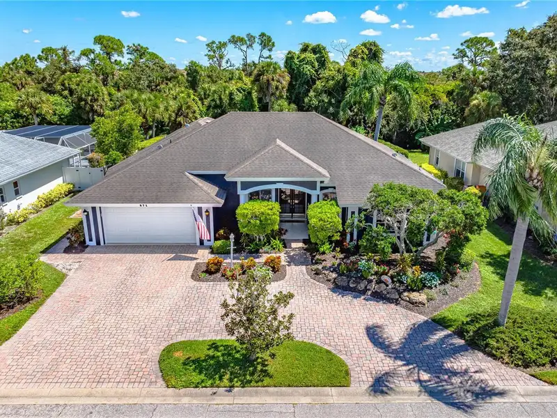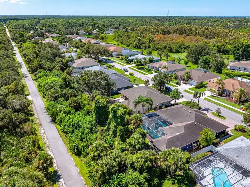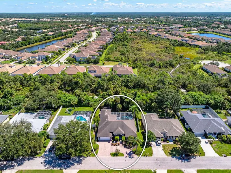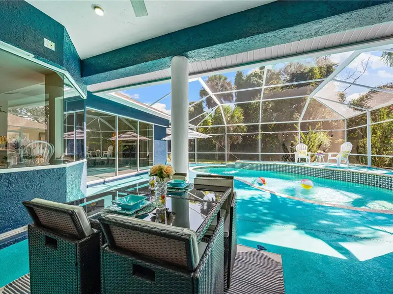 One of the largest homes in Bay Oaks Estates, this 5-bed, 2.5-bath single-story pool retreat delivers the best of indoor-outdoor Florida living with flexible spaces for guests, work, and play. Curb appeal pops with a brick paver circular drive, lush landscaping, and a covered, columned entry with French double doors and an arched transom. Inside, high ceilings and an abundance of natural light set a welcoming tone. The formal living and dining rooms flow to the heart of the home – a well-appointed kitchen designed for everyday living and entertaining, featuring granite counters, tile backsplash, stainless appliances, a center island with raised breakfast bar, closet pantry, built-in desk and wine rack, recessed & pendant lighting, and a picturesque breakfast nook with wraparound windows. The kitchen opens to the spacious family room with a tray ceiling and mirrored media niche. A pocketing three-panel slider seamlessly extends the living space to the covered lanai and screened pool; additional sliders from the formal living room, the primary suite, and a secondary bedroom maintain the indoor–outdoor connection. Out back, the lanai enjoys a private, tranquil, tree-lined backdrop, overlooking a curved, free-form pool with twin arc fountain jets, a raised sun terrace for lounging, and generous space to relax or gather. A screen door leads to the lawn and a separate pergola patio with power – perfect for morning coffee or an evening grill. From the backyard you have direct access to the Legacy Trail, the popular paved, multi-use path linking Sarasota and Venice, for miles of biking and walking through nature. The private primary retreat offers lanai access, two closets (one walk-in), and a spa-like en-suite bath with a Jacuzzi jetted soaking tub framed by an arched window with plantation shutters, separate walk-in shower with wall body sprays, a long double vanity, and a private water closet. Thoughtful split-bedroom design places three secondary bedrooms and a full bath together in their own wing (one is oversized with lanai access that can flex as a game/media space), while a full 5th bedroom – currently used as an office – sits near the primary suite. An interior laundry room adds storage shelves, cabinets, and a utility sink. Major updates for peace of mind include: replumbed water lines, roof (2015), A/C (2019), new water heater (2024), new pool pump (2024), kitchen appliances (2021), washer and dryer (2023), polycarbonate storm panels, and irrigation. All in a well-kept, low-fee, pet-friendly Osprey community conveniently located just minutes from top-rated schools, including the prestigious Pine View School, and close to the Gulf beaches of world-renowned Siesta Key, Nokomis, and Venice, as well as Oscar Scherer State Park, and a variety of shopping, dining, entertainment, and everyday conveniences; the Gulf Coast lifestyle at its finest. Schedule your private showing today and fall in love with the lifestyle that 571 Pine Ranch East Rd has to offer.