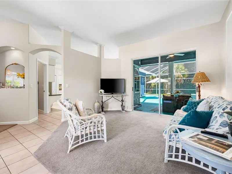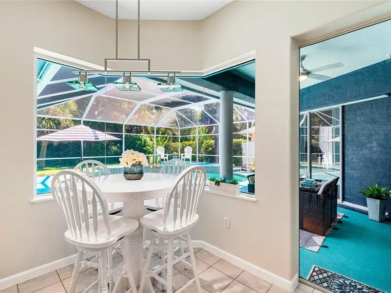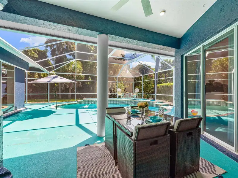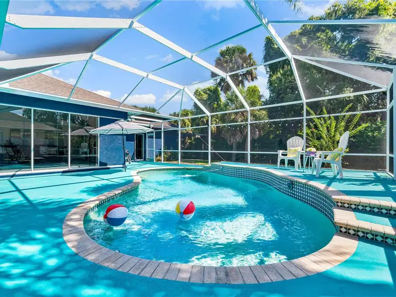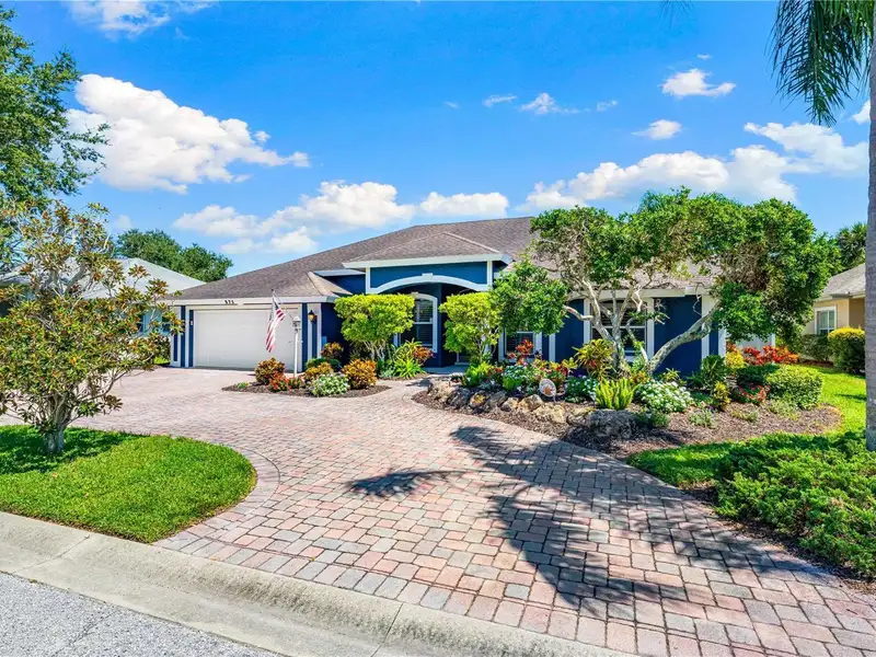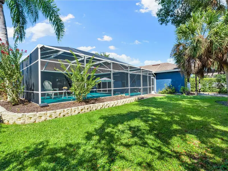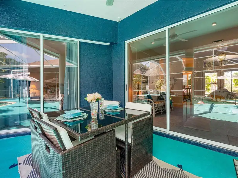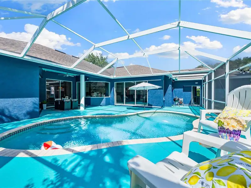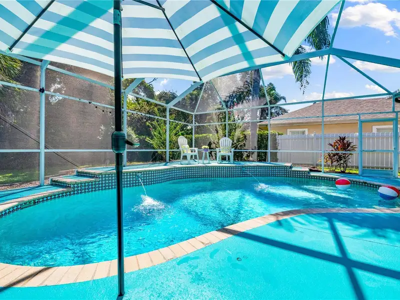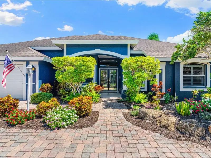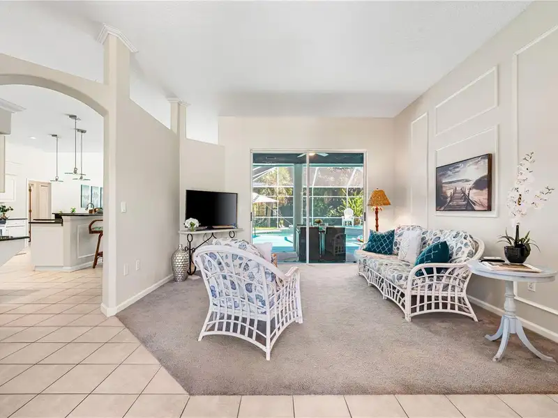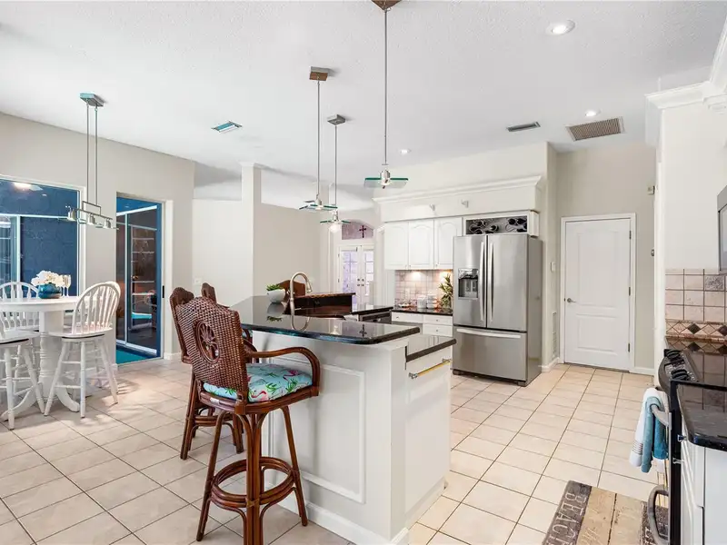 One of the largest homes in Bay Oaks Estates, this 5-bed, 2.5-bath single-story pool retreat delivers the best of indoor-outdoor Florida living with flexible spaces for guests, work, and play. Curb appeal pops with a brick paver circular drive, lush landscaping, and a covered, columned entry with French double doors and an arched transom. Inside, high ceilings and an abundance of natural light set a welcoming tone. The formal living and dining rooms flow to the heart of the home – a well-appointed kitchen designed for everyday living and entertaining, featuring granite counters, tile backsplash, stainless appliances, a center island with raised breakfast bar, closet pantry, built-in desk and wine rack, recessed & pendant lighting, and a picturesque breakfast nook with wraparound windows. The kitchen opens to the spacious family room with a tray ceiling and mirrored media niche. A pocketing three-panel slider seamlessly extends the living space to the covered lanai and screened pool; additional sliders from the formal living room, the primary suite, and a secondary bedroom maintain the indoor–outdoor connection. Out back, the lanai enjoys a private, tranquil, tree-lined backdrop, overlooking a curved, free-form pool with twin arc fountain jets, a raised sun terrace for lounging, and generous space to relax or gather. A screen door leads to the lawn and a separate pergola patio with power – perfect for morning coffee or an evening grill. From the backyard you have direct access to the Legacy Trail, the popular paved, multi-use path linking Sarasota and Venice, for miles of biking and walking through nature. The private primary retreat offers lanai access, two closets (one walk-in), and a spa-like en-suite bath with a Jacuzzi jetted soaking tub framed by an arched window with plantation shutters, separate walk-in shower with wall body sprays, a long double vanity, and a private water closet. Thoughtful split-bedroom design places three secondary bedrooms and a full bath together in their own wing (one is oversized with lanai access that can flex as a game/media space), while a full 5th bedroom – currently used as an office – sits near the primary suite. An interior laundry room adds storage shelves, cabinets, and a utility sink. Major updates for peace of mind include: replumbed water lines, roof (2015), A/C (2019), new water heater (2024), new pool pump (2024), kitchen appliances (2021), washer and dryer (2023), polycarbonate storm panels, and irrigation. All in a well-kept, low-fee, pet-friendly Osprey community conveniently located just minutes from top-rated schools, including the prestigious Pine View School, and close to the Gulf beaches of world-renowned Siesta Key, Nokomis, and Venice, as well as Oscar Scherer State Park, and a variety of shopping, dining, entertainment, and everyday conveniences; the Gulf Coast lifestyle at its finest. Schedule your private showing today and fall in love with the lifestyle that 571 Pine Ranch East Rd has to offer.