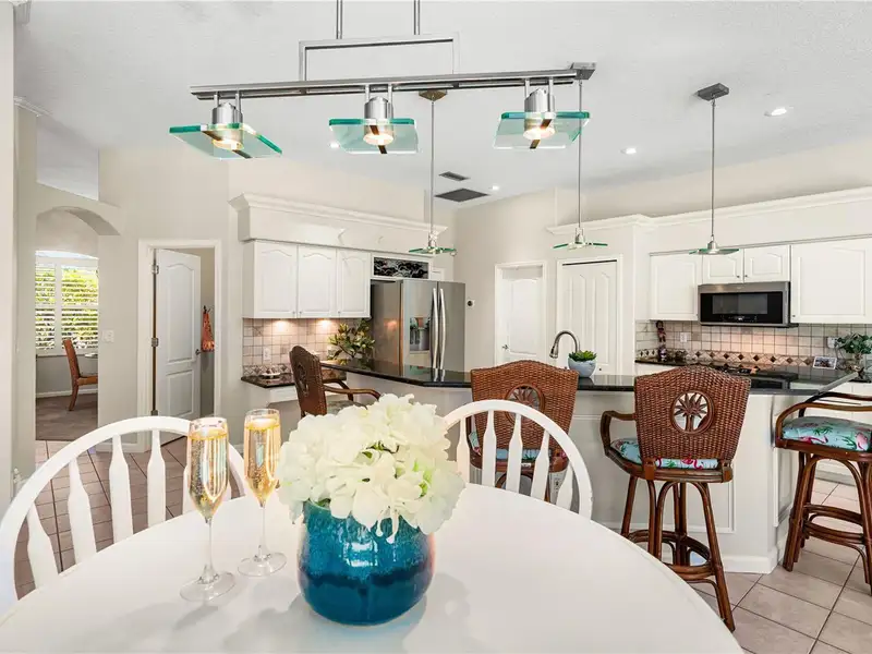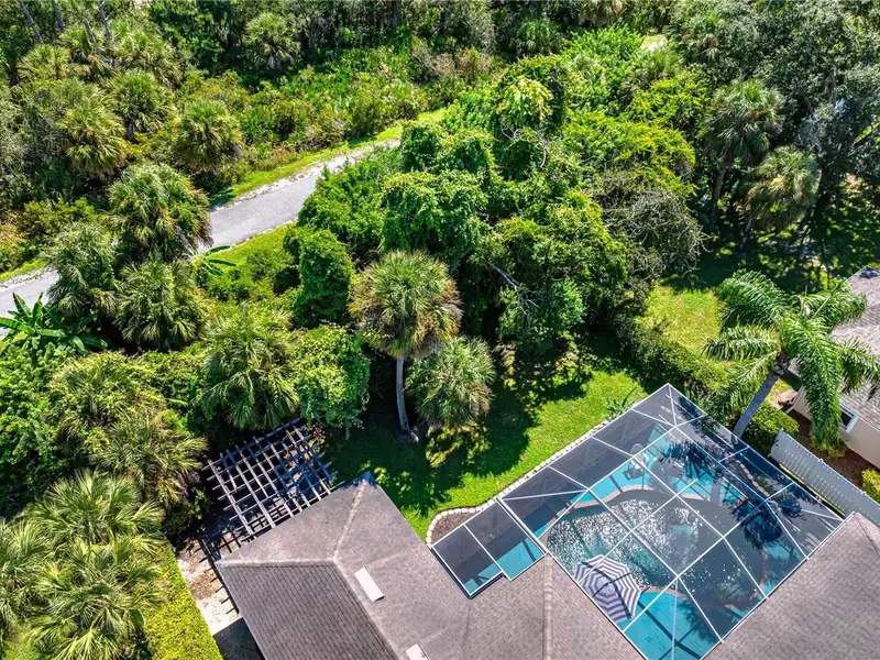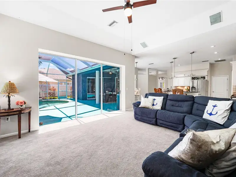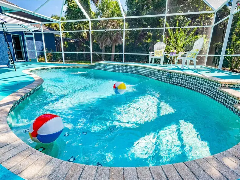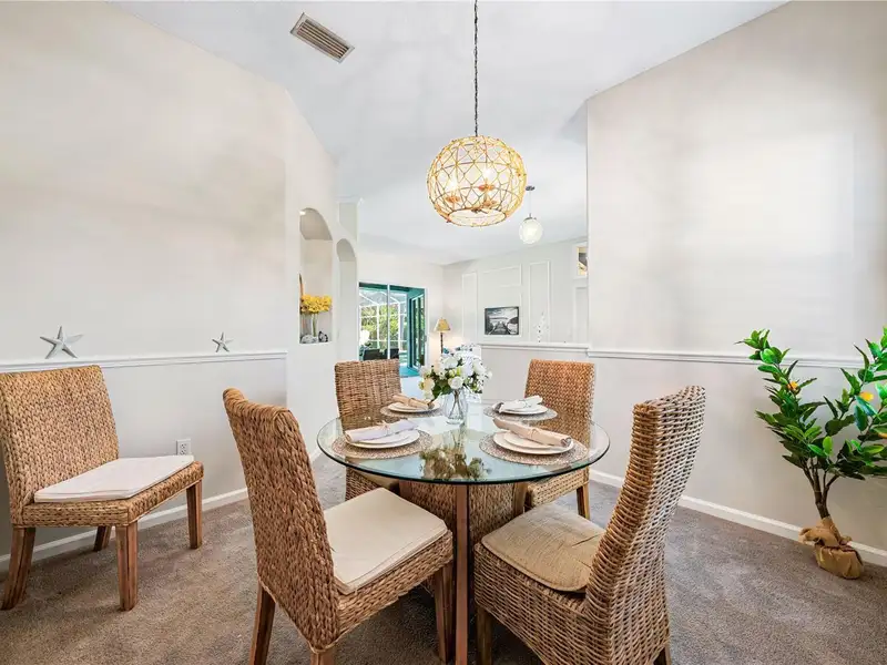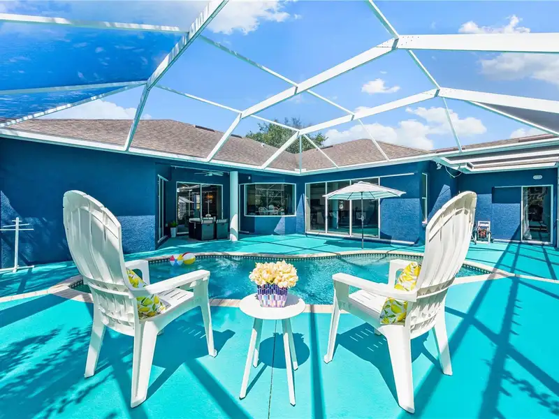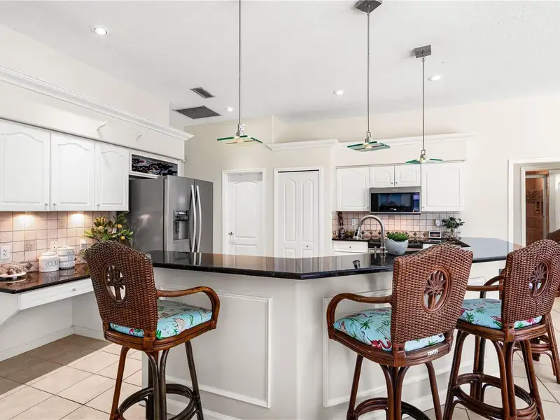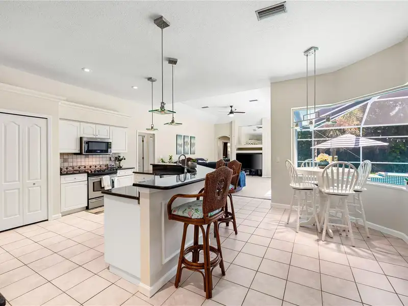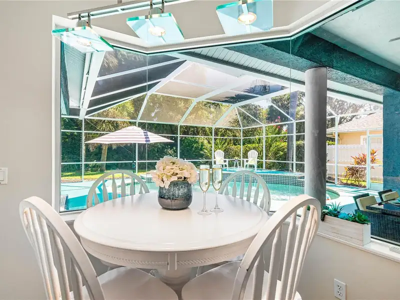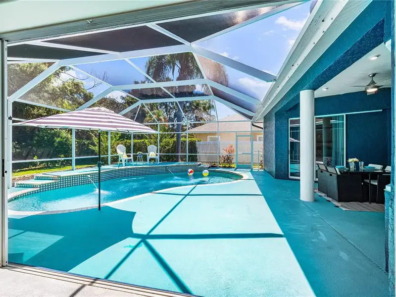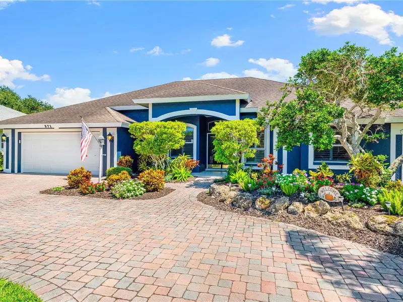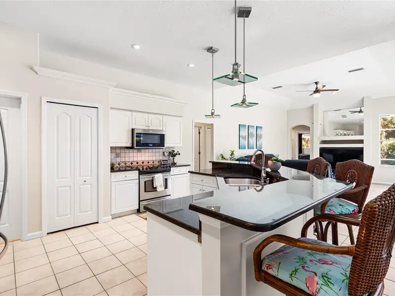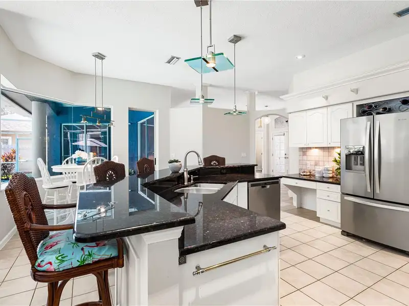 One of the largest homes in Bay Oaks Estates, this 5-bed, 2.5-bath single-story pool retreat delivers the best of indoor-outdoor Florida living with flexible spaces for guests, work, and play. Curb appeal pops with a brick paver circular drive, lush landscaping, and a covered, columned entry with French double doors and an arched transom. Inside, high ceilings and an abundance of natural light set a welcoming tone. The formal living and dining rooms flow to the heart of the home – a well-appointed kitchen designed for everyday living and entertaining, featuring granite counters, tile backsplash, stainless appliances, a center island with raised breakfast bar, closet pantry, built-in desk and wine rack, recessed & pendant lighting, and a picturesque breakfast nook with wraparound windows. The kitchen opens to the spacious family room with a tray ceiling and mirrored media niche. A pocketing three-panel slider seamlessly extends the living space to the covered lanai and screened pool; additional sliders from the formal living room, the primary suite, and a secondary bedroom maintain the indoor–outdoor connection. Out back, the lanai enjoys a private, tranquil, tree-lined backdrop, overlooking a curved, free-form pool with twin arc fountain jets, a raised sun terrace for lounging, and generous space to relax or gather. A screen door leads to the lawn and a separate pergola patio with power – perfect for morning coffee or an evening grill. From the backyard you have direct access to the Legacy Trail, the popular paved, multi-use path linking Sarasota and Venice, for miles of biking and walking through nature. The private primary retreat offers lanai access, two closets (one walk-in), and a spa-like en-suite bath with a Jacuzzi jetted soaking tub framed by an arched window with plantation shutters, separate walk-in shower with wall body sprays, a long double vanity, and a private water closet. Thoughtful split-bedroom design places three secondary bedrooms and a full bath together in their own wing (one is oversized with lanai access that can flex as a game/media space), while a full 5th bedroom – currently used as an office – sits near the primary suite. An interior laundry room adds storage shelves, cabinets, and a utility sink. Major updates for peace of mind include: replumbed water lines, roof (2015), A/C (2019), new water heater (2024), new pool pump (2024), kitchen appliances (2021), washer and dryer (2023), polycarbonate storm panels, and irrigation. All in a well-kept, low-fee, pet-friendly Osprey community conveniently located just minutes from top-rated schools, including the prestigious Pine View School, and close to the Gulf beaches of world-renowned Siesta Key, Nokomis, and Venice, as well as Oscar Scherer State Park, and a variety of shopping, dining, entertainment, and everyday conveniences; the Gulf Coast lifestyle at its finest. Schedule your private showing today and fall in love with the lifestyle that 571 Pine Ranch East Rd has to offer.