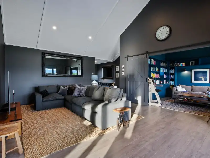 The home itself blends warmth with elegance. Heated by both a log fire and a zoned underfloor hydronic system throughout, it also benefits from air exchange and climate control. Stylish flooring runs through the living areas, complemented by high stud timber ceilings, solar tube skylights, and moody color palettes that create an ambience of refined calm.