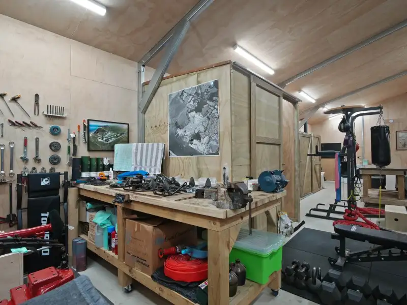 Beyond the home, the lifestyle offering is exceptional. A 172m² dedicated workshop, complete with fire, kitchenette, bathroom, laundry, specialist power point for welding, and bespoke storage for outdoor gear. A professional gym setup, movable stainless bench, and adjoining covered outdoor area ensure this space is as versatile as it is practical.
