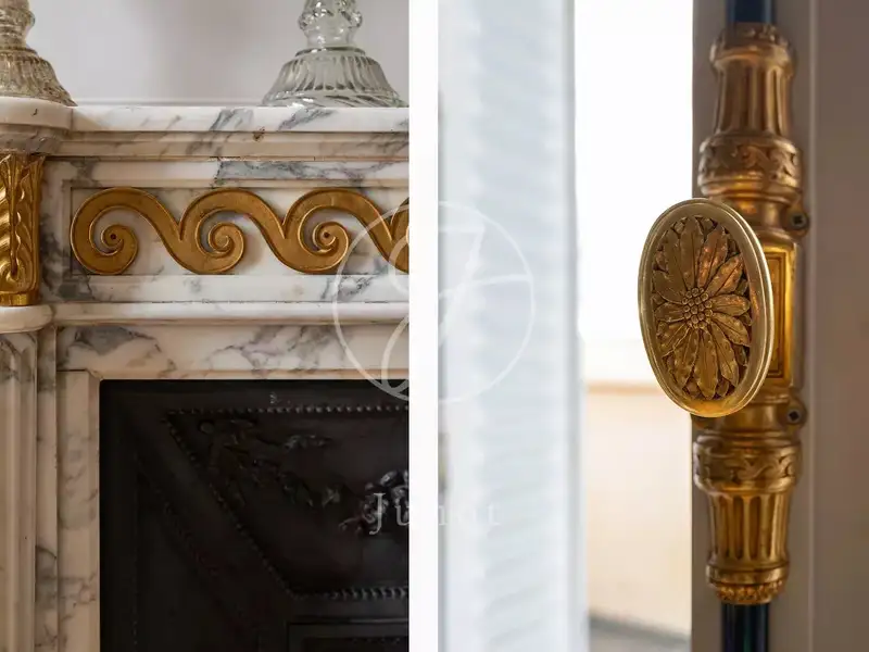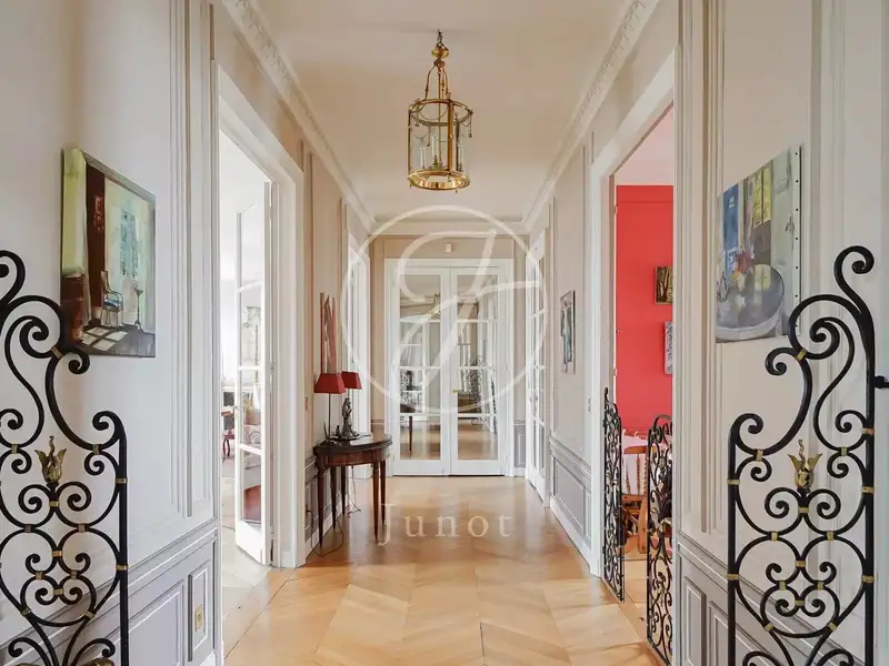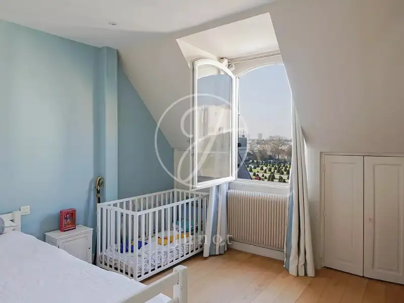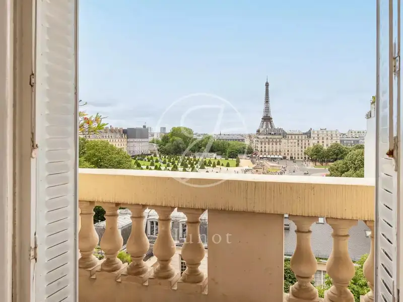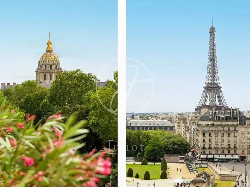 Located on the fifth and sixth floors of a luxury building with elevator, this elegant 266.26 m² (266.26 sq.ft. Carrez law) through-apartment boasts character, generous volumes and breathtaking, unobstructed views of the Eiffel Tower and numerous Parisian monuments. Right from the entrance, the tone is set: a luminous double reception room opens onto a large balcony, offering a breathtaking view over the rooftops and monuments of Paris, an elegant dining room, a spacious dining kitchen with authentic charm and terracotta floor tiles, a laundry room, an office (or bedroom) with shower room, a library and a master suite with private shower room, large dressing room and two separate toilets. Upstairs, three air-conditioned bedrooms with dressing rooms, bathrooms, shower rooms and toilets offer equally exceptional views. This exceptional apartment boasts Haussmann-style charm, enhanced by high ceilings, herringbone parquet flooring, magnificent moldings and original fireplaces in perfect condition. A cellar and wine cellar complete this unique property in a sought-after, highly secure neighborhood.