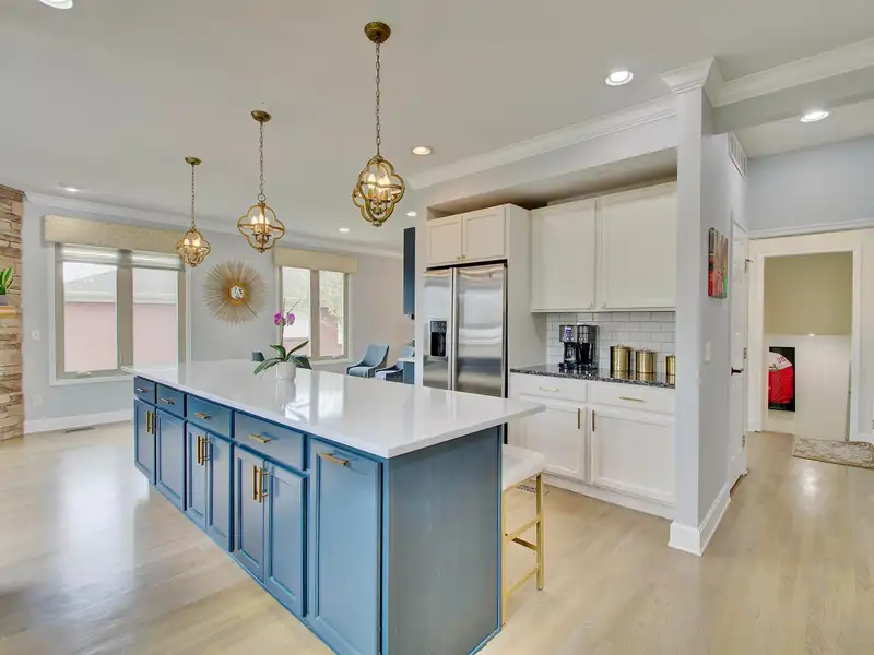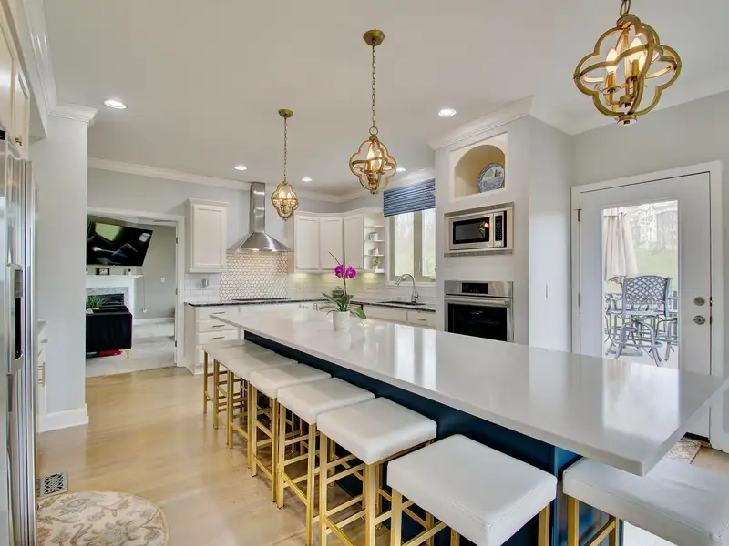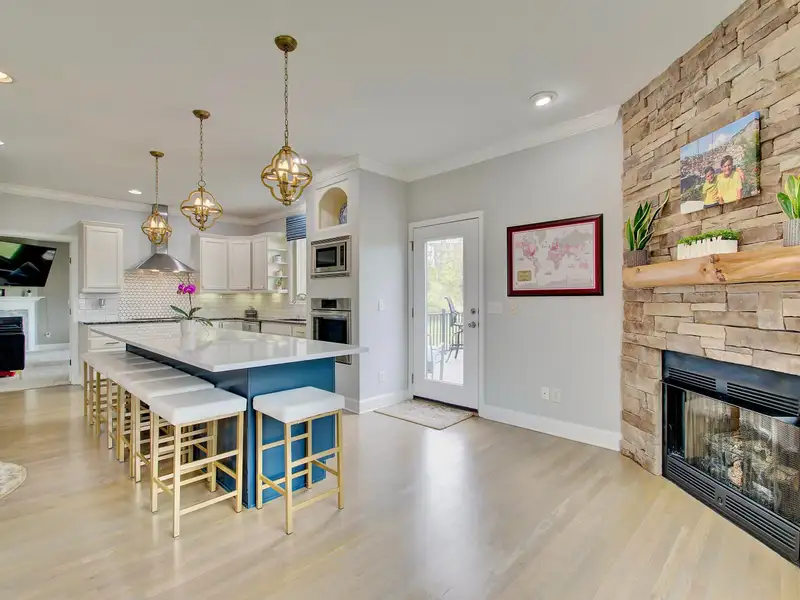 - Kitchen with large island and stainless appliances
