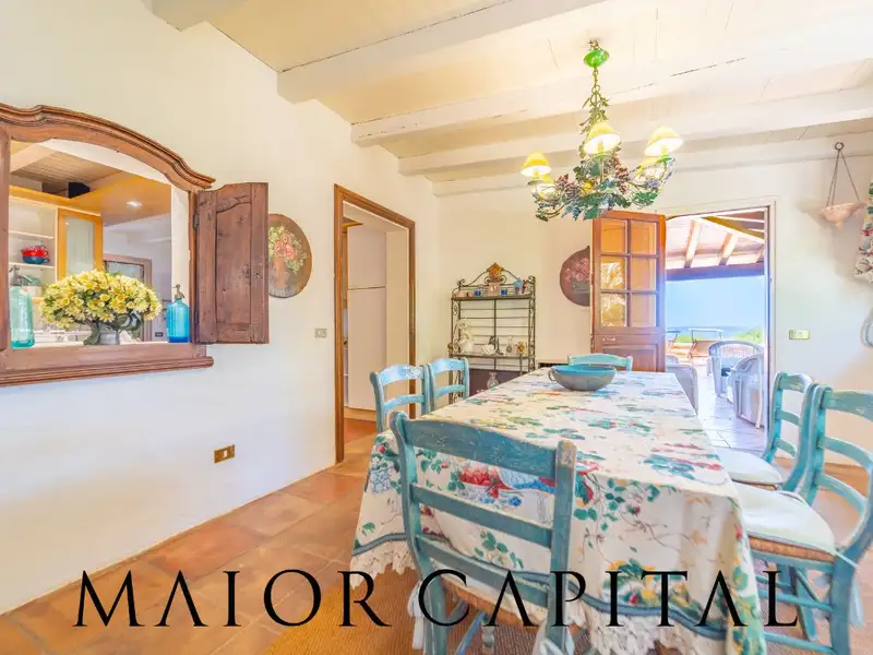 The villa develops on two well-separated levels, connected by elegant internal and external stairs. Access to the ground floor is through a covered patio with a zenithal opening, which creates a play of natural light, perfect for a refined and suggestive entrance. The ground floor hosts a spacious, bright living room with direct access to three panoramic verandas, offering a spectacular sea view. The living area is completed by a dining room, a separate kitchen, and a guest bathroom, ensuring maximum comfort.