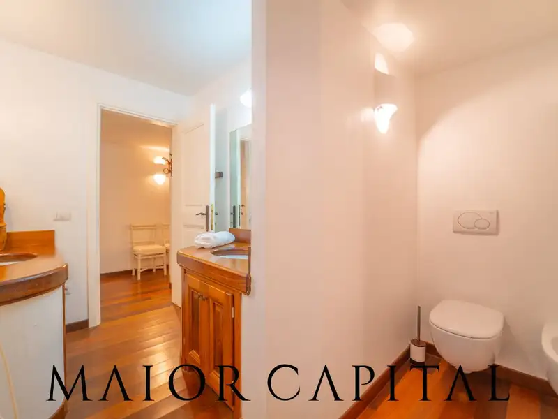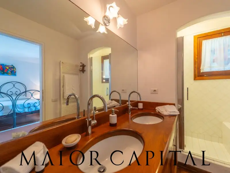On the lower floor, also accessible via an external entrance, there are four double bedrooms, all bright and generously spacious, with direct access to the garden or terrace via French windows, ensuring privacy and independence for guests. Each bedroom has a large, functional bathroom, while a relaxation lounge and hallway complete the floor, creating an elegant and welcoming environment.