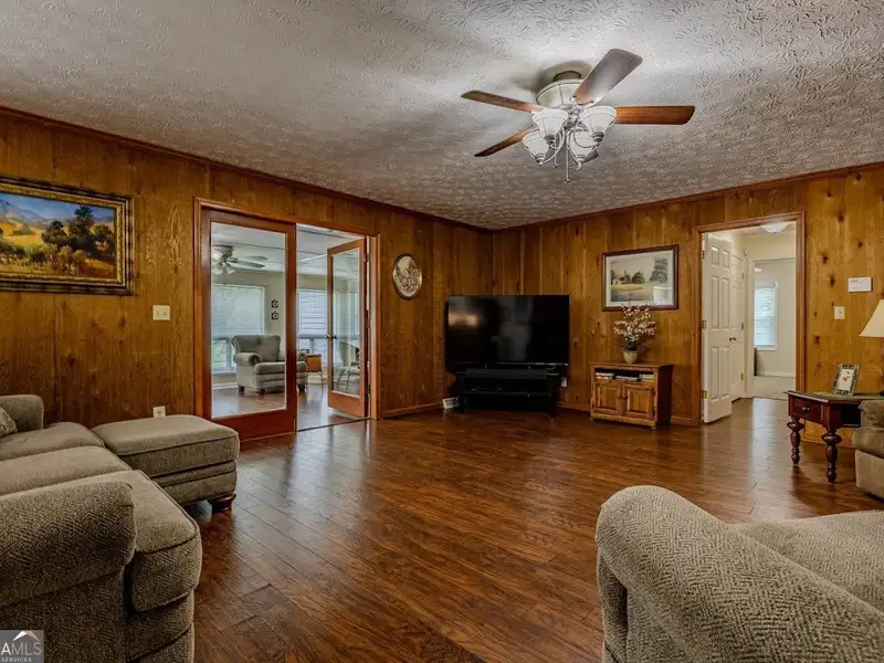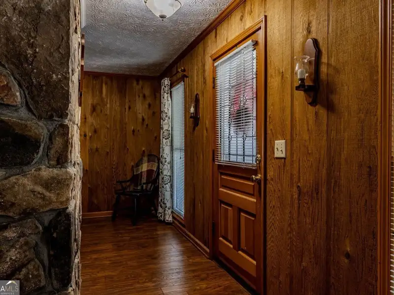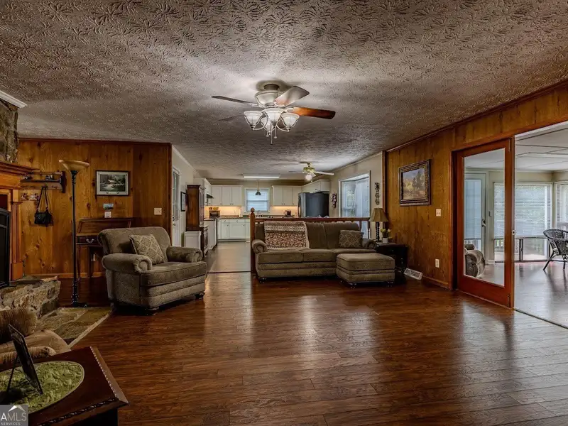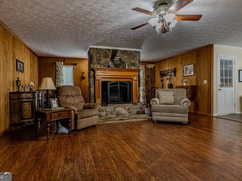 - Wood paneled living room with rock fireplace