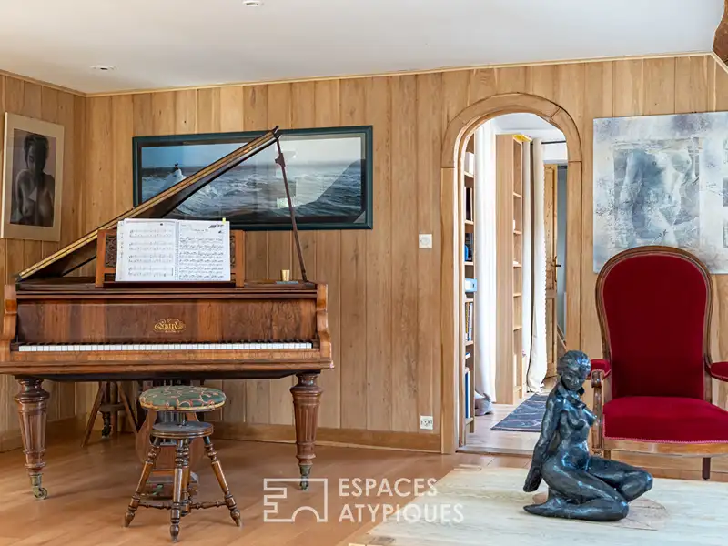 The entrance opens onto a cathedral-style living room enhanced by beautiful high ceilings and exposed beams. This magnificent living room houses a fully equipped, welcoming, and functional open-plan kitchen. The main level also includes two bedrooms, one with a large dressing room and the other on two levels, as well as a bathroom with a shower. An open staircase leads to a mezzanine housing a large office and a spare room. Below, two small outbuildings and two carports complete this rare ensemble.