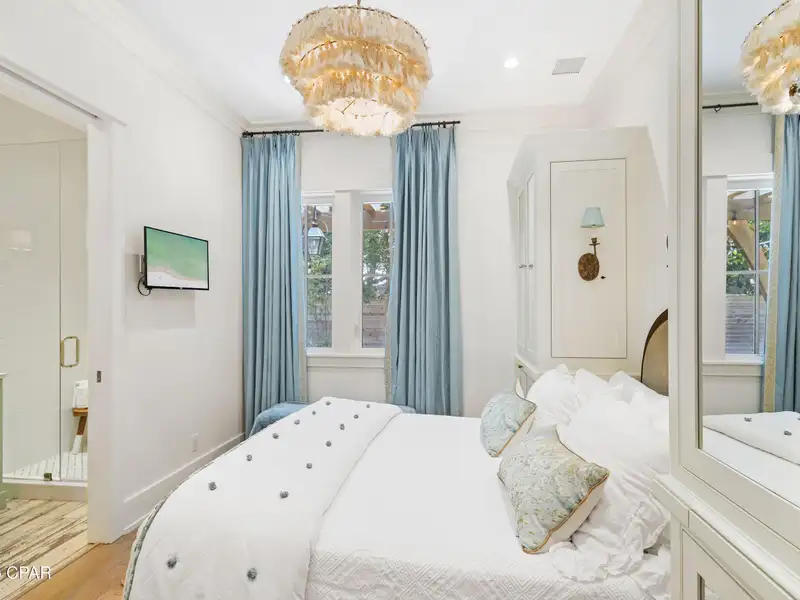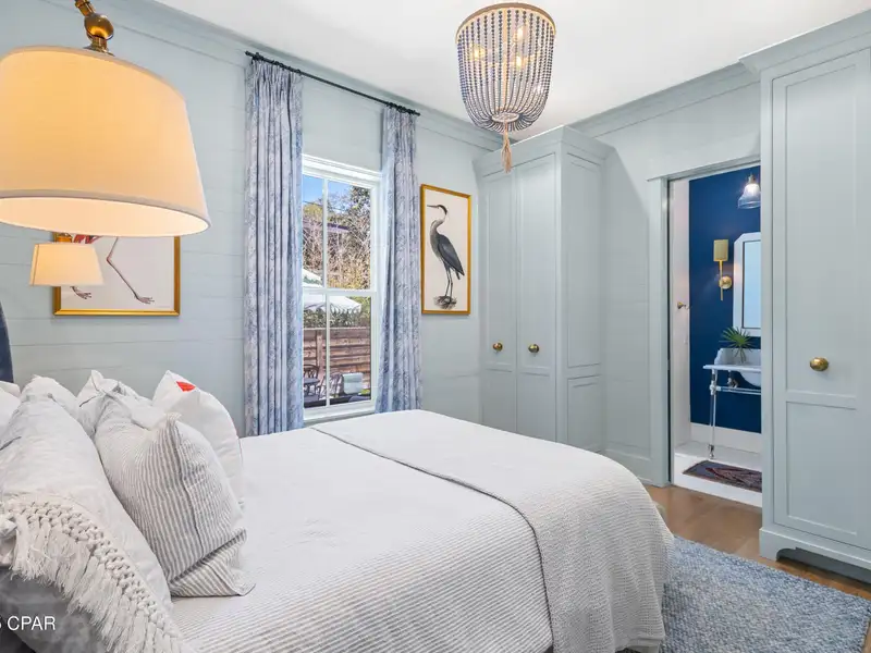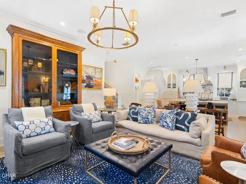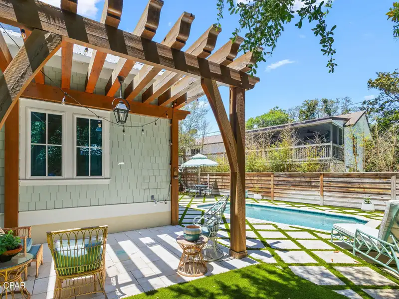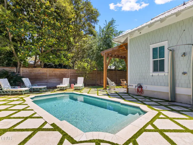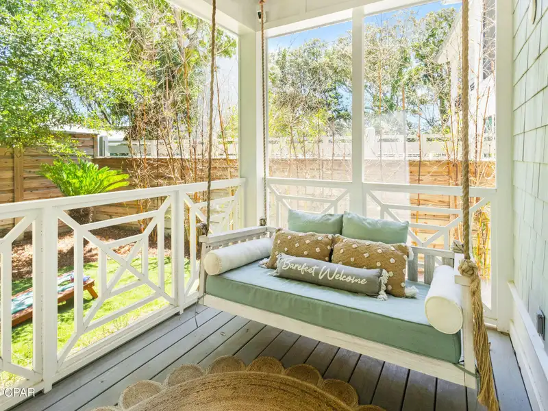 Welcome to 50 Camellia Street - a home where Southern charm meets coastal living in the heart of Old Seagrove Beach, just a bike ride from the energy of Seaside and WaterColor and just steps to the serenity of the Gulf. This property is a custom-crafted Southern Living plan, built by renowned 30A builder Mark Bakane. This refined coastal retreat seamlessly blends notes of timeless lowcountry architectural features with relaxed beachside elegance. From the moment you arrive, the home's craftsmanship is evident. Inviting expansive front porches, natural wood accents and exterior gas lanterns illuminate the exterior beauty of this home. Step onto the storybook front porch where timeless Southern charm meets laid-back coastal luxury. Framed by classic shutters and natural wood elements this space offers a private, breezy retreat perfect for morning coffee or evening cocktails. Tongue-and-groove ceilings, woven seating, and coastal-inspired lighting set the tone for relaxed gatherings with friends and family. Whether you're dining alfresco at the farmhouse-style table or unwinding beneath the ceiling fan with a good book, this inviting porch feels like an extension of the home's heart - warm, welcoming, and wonderfully serene. Inside, the home opens to a large living space framed by shiplap walls, rich wood flooring, and designer lighting. The gourmet kitchen is a showstopper, outfitted with custom cabinetry, top-tier appliances, marble countertops, and an oversized island made for entertaining. The floor plan offers multiple living areas, generous guest accommodations on the first and second levels, and a private owner's suite that feels like a true sanctuary with spa-inspired finishes. Outdoor living is elevated with generous porches and a tranquil backyard space. The backyard is an entertainer's dream, centered around a resort-style pool that exudes luxury. Framed by elegant stone pavers set in lush green turf, the design strikes a perfect balance between sophistication and coastal charm. Ample space for lounging under the sun surrounds the water, while a pergola-covered seating area invites relaxed gatherings or evening cocktails by the pool. Whether you're hosting summer celebrations or enjoying quiet mornings, this thoughtfully curated outdoor oasis elevates everyday living.
