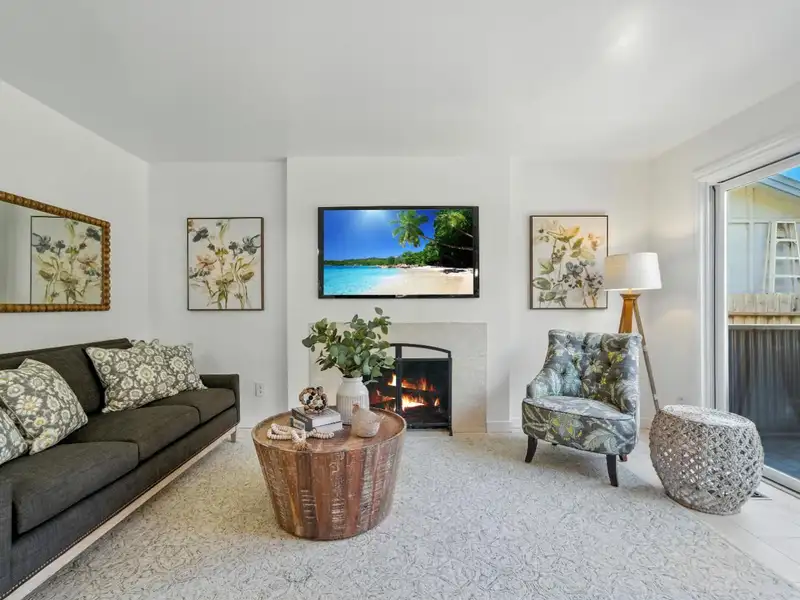- Den with fireplace and deck access