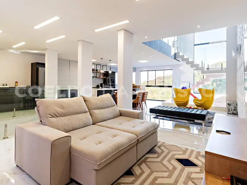 Tenha o privilégio de viver em uma Casa de Alto Padrão, localizada em um Condomínio com excelente custo benefício e infraestrutura completa. Esse imóvel oferece uma vista permanente para a mata preservada, com um lote em declive considerado o melhor do condomínio. A casa é repleta de iluminação natural, graças às amplas janelas que proporcionam um ambiente arejado e acolhedor. Com detalhes de qualidade, como porcelanatos de 1ª linha e pé direito duplo com mais de 6m, a residência exibe elegância e sofisticação. Além disso, conta com todos os ambientes climatizados com ar condicionado e móveis planejados de alta qualidade.