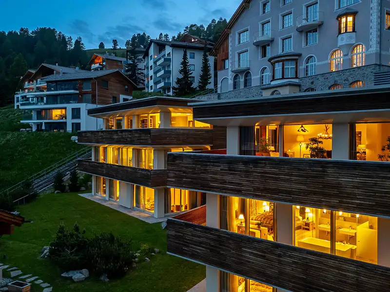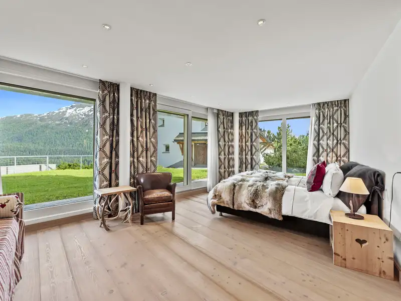 This exclusive villa in St. Moritz offers the perfect combination of contemporary luxury and homely ambience extending over 506 square meters or so of living space. The heart of the home is the stylish kitchen along with the spacious living and dining area with a fireplace open on two sides on the top floor. Below, spread over two floors, are the seven stylish bedrooms, each with an ensuite bathroom, plus a music or playroom. Another advantage is the lift, which connects all floors. The generously sized ancillary rooms on the basement levels are mostly in a shell condition and offer the possibility to install an indoor swimming pool with a wellness zone, a home cinema, a wine cellar, and much more. Six parking spaces are available in the underground garage shared with the neighbors. A particular attraction is the large terrace at living level and the beautiful garden area, from where there are breathtaking views of the surrounding mountains and Lake St. Moritz. The property - Approx. 506m² living space - 7 bedrooms with ensuite bathrooms - Sightline-protected lake and mountain vistas - Generous ancillary rooms for indoor pool, home cinema, etc. - Lift to all floors - 7 garage spaces - Terrace and outdoor seating area - Fireplace
