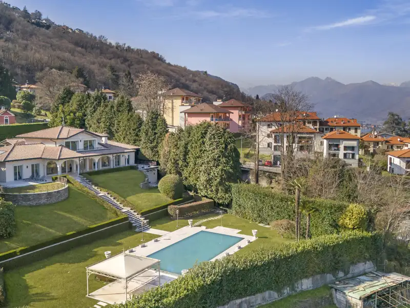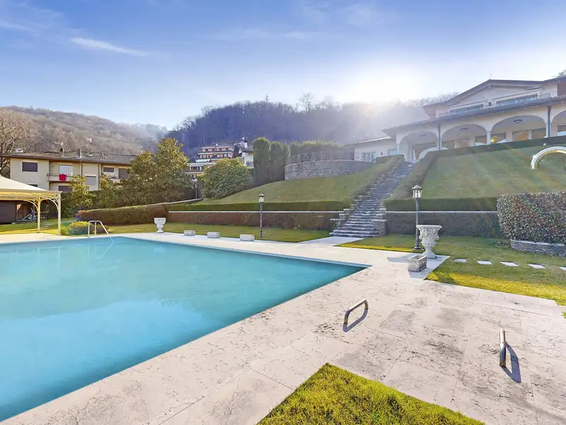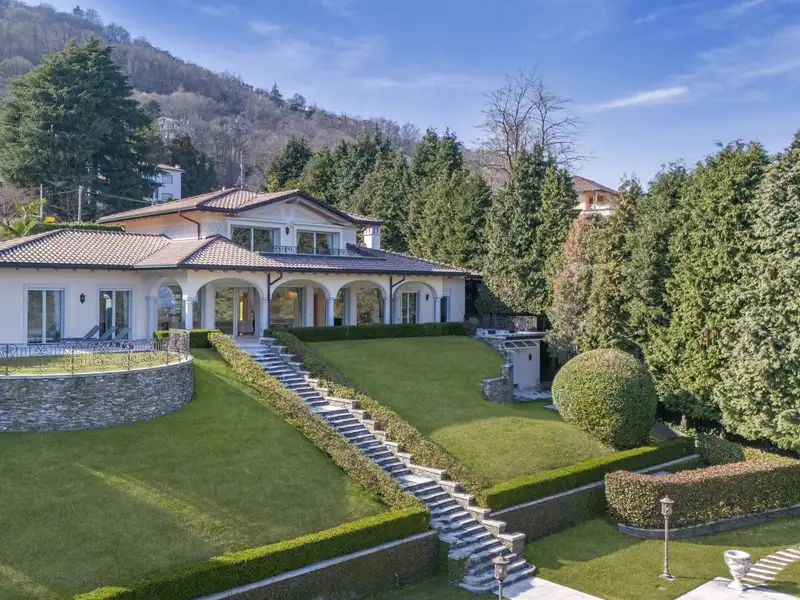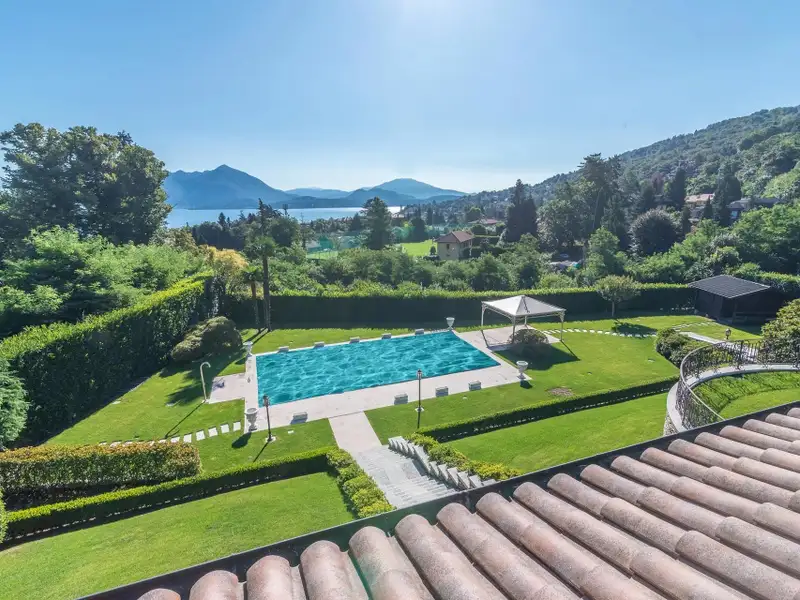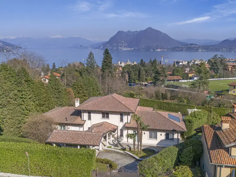 In a dominant and private position, just minutes from the center of Stresa, stands this exclusive luxury lake-view villa, surrounded by greenery and overlooking one of the most spectacular views of Lake Maggiore. A unique property of value, ideal for those seeking an elegant and modern residence in Piedmont, perfectly integrated into the landscape. Built on a 3,460-square-meter plot, this exclusive property in Stresa is the result of the design of a leading Italian engineer and the construction by a major local company. The result is a beautifully designed villa that blends classic architecture and state-of-the-art living technologies, designed to ensure maximum comfort. The villa is spread over a total area of about 500 square meters distributed on three levels, with bright rooms and luxury finishes: parquet floors, marble tiling, large panoramic windows framing the breathtaking view of Lake Maggiore and the town of Stresa. The main floor welcomes with a dramatic entrance with two large columns leading to the large living room, overlooking a covered terrace, perfect for lake view breakfasts or sunset dinners. The kitchen, modern and functional, is separate and connects with the living area. Completing the floor are two double bedrooms with walk-in closets and en suite bathrooms, a fitness area with a terrace-easily convertible into a third bedroom-and a service bathroom. On the upper floor is the master suite, an exclusive sleeping area consisting of a master bedroom with private terrace, large walk-in closet, designer bathroom and a private study, ideal for working from home in luxury and absolute privacy. The basement floor houses an independent apartment for service personnel. It includes a living area with kitchen and dining room, master bedroom with private bathroom and a separate terrace. Also present are a wine cellar and a technical room with boiler. The well-kept garden, planted with fine essences, houses a heated swimming pool with solarium, a wooden gazebo, outdoor shower and a relaxation area from which to enjoy the panoramic view of Lake Maggiore. The property also includes a wooden tool shed and a separate garage with two covered parking spaces. From a technological point of view, the villa is equipped with the most modern facilities: underfloor heating, controlled mechanical ventilation system, centralized air conditioning, solar panels, electric shutters and awnings, and state-of-the-art alarm system. This luxury villa for sale in Stresa is the perfect solution for those looking for a prestigious property on Lake Maggiore, ideal as a first home or summer residence. An authentic charming retreat where you can live immersed in nature, without sacrificing style, innovation and tranquility.