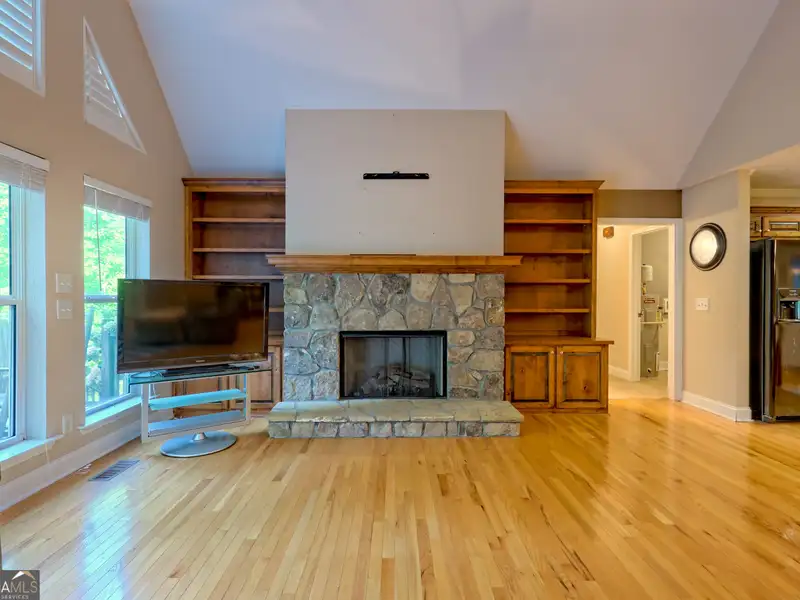 - Stone fireplace with built-in bookcases