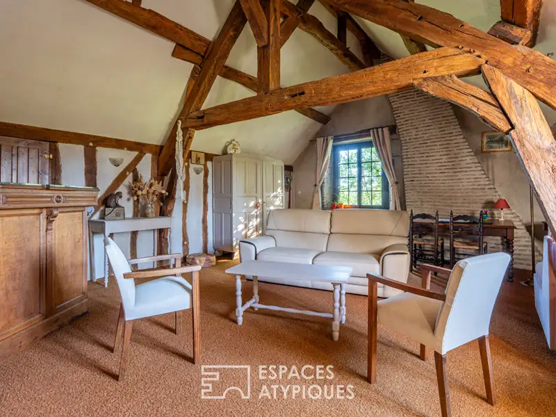 The ground floor features a vast 70 sqm living room, where half-timbering, a stone fireplace, and exposed beams punctuate the living and dining areas. A kitchen opening onto the exterior completes this level, as does a master suite comprising a 20 sqm bedroom, dressing room, and bathroom. Upstairs, a large, bright mezzanine extends the space and can be converted into an additional bedroom. A second bedroom with a bathroom is added, enhanced by a spectacular exposed beam. On the exterior, the charm of Sologne is fully expressed: old stables, workshop and a superb barn of approximately 100 sqm on the ground are harmoniously organized around the courtyard. These outbuildings offer strong development potential, whether for a family project or tourist reception.