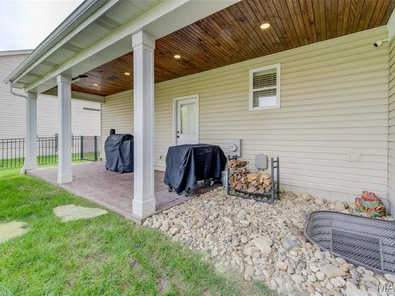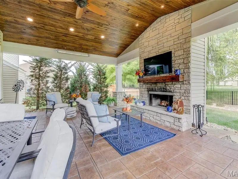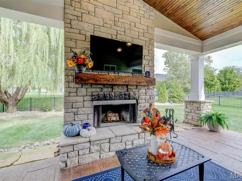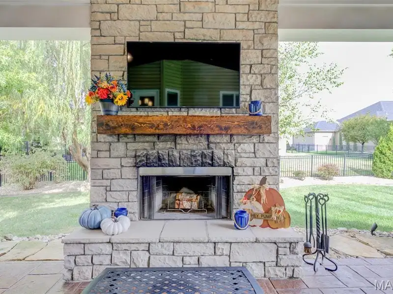 - Large covered patio with stone fireplace